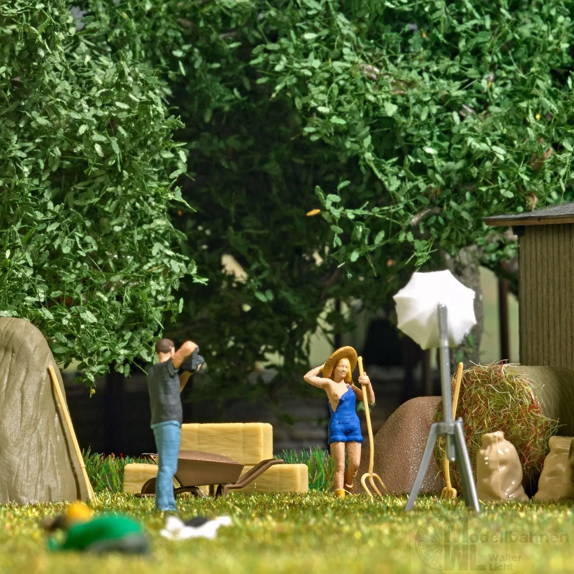 Freizügig gestyltes Model mit Zubehör für die Heuernte: Heuhaufen, Strohballen, Säcke und Stallwerkzeug. Auch für Foto-Shootings geeignet, passende Fotografen: H0 79810.
