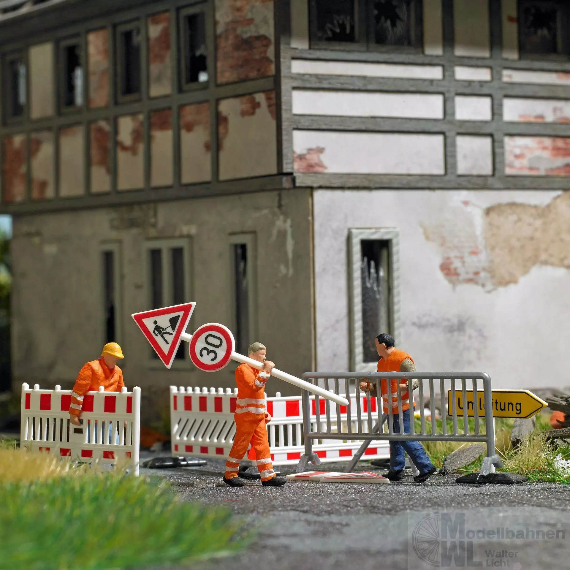 3 Straßenbauarbeiter in Arbeitskleidung der Epoche V. Mit verschiedenen Absperrungen, passenden Verkehrsschildern, Pylonen, Sandhaufen und Straßenbau-Werkzeugen.