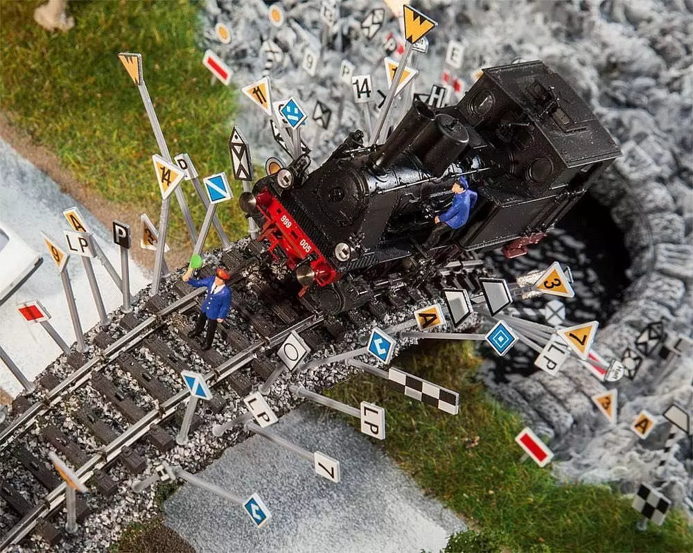 Eisenbahnsignal-Set mit 190 digital bedruckten Streckenschildern und Hinweistafeln mit Pfosten.