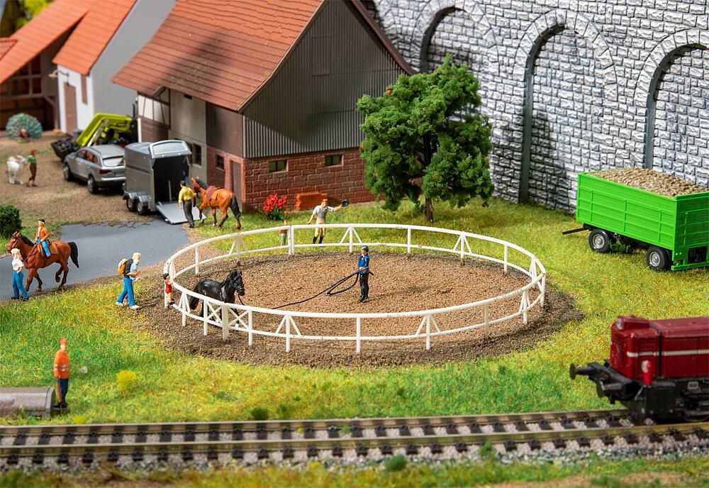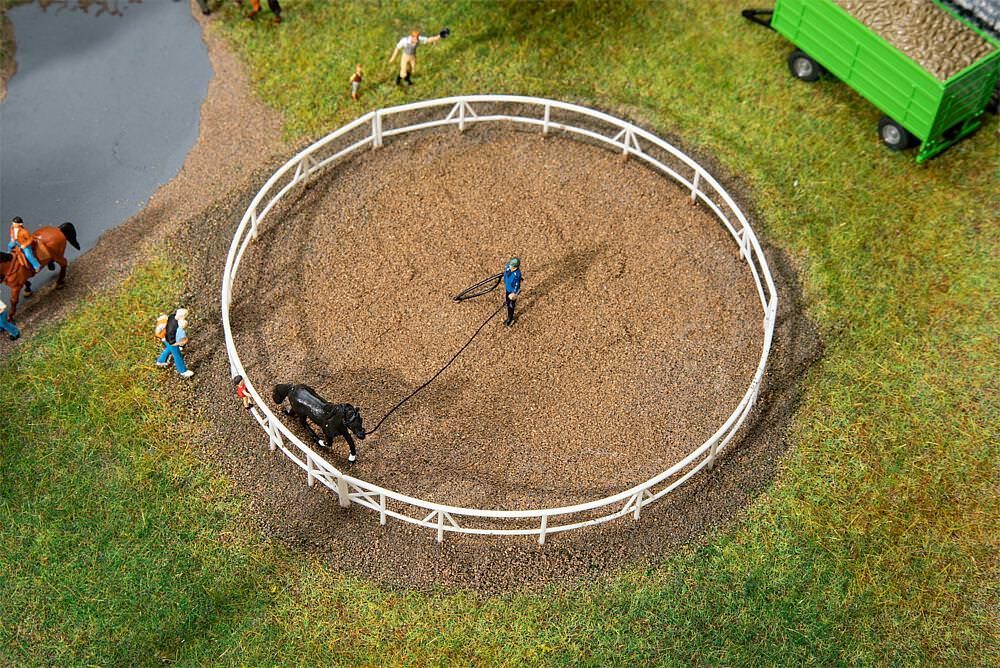 Rund eingezäunter, besandeter Außenreitplatz. Pferd und Reiter bei der Bodenarbeit liegen als Miniaturfiguren für die Szenengestaltung bei.