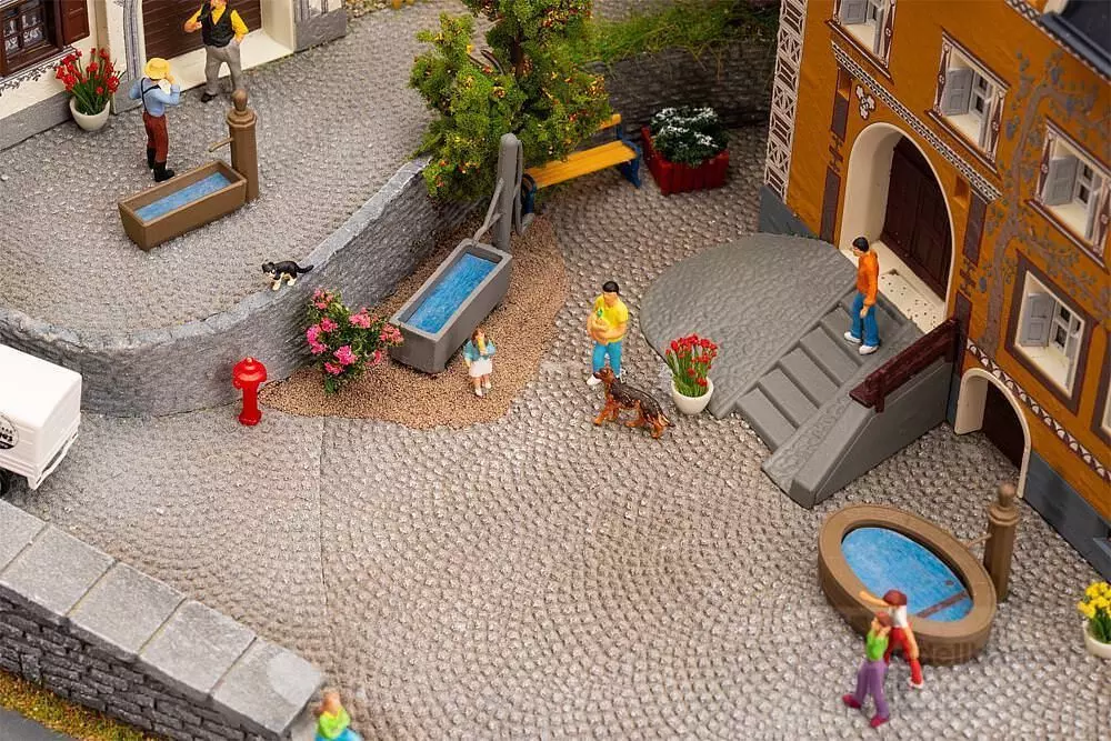In jedem Ort waren sie Treffpunkt und Mittelpunkt. Die Dorfbrunnen. Dieses Set umfasst zwei eckige Steinbrunnen, davon eins mit gusseiserner Wasserpumpe sowie einen ovalen Holzbrunnen. Eine Wasserfolie für realistische Wassereffekte liegt dem Bausatz bei.