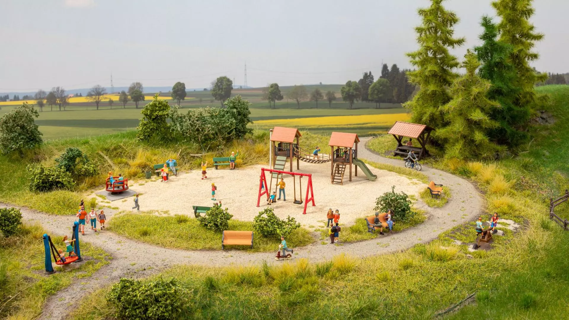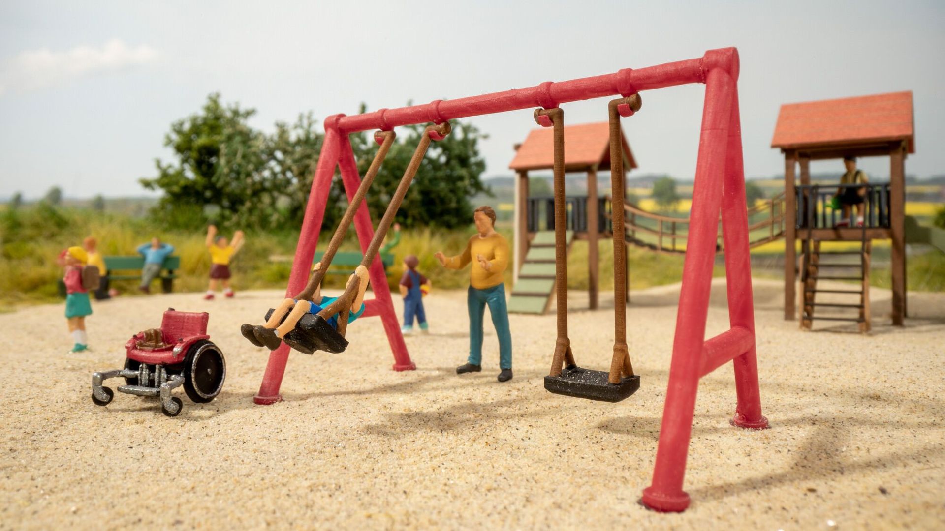 Die NOCH "micro-motion Schaukel" eignet sich hervorragend, um einen Kinderspielplatz wie in der Wirklichkeit nachzugestalten und in Szene zu setzen. Wer erinnert sich nicht gerne an die schönen Tage im Sommer zurück, wo man mit den besten Freunden auf dem Spielplatz auf der Schaukel saß. Ob kleine oder große Kinder - hier kribbelt es bei jedem im Bauch wenn der Papa, die Mama oder auch die Großeltern von hinten schwungvoll das Kind auf der Schaukel anschucken. Wenn man den Trick raus hat, wie man sich alleine anschuckt, schwingt man in hohem Bogen durch die Lüfte und sieht den großen Spielplatz von oben. Das erweckt doch wirklich bei jedem wunderschöne Erinnernungen an einen Tag auf dem Spielplatz mit den Liebsten. Neben der Schaukel erfreuen sich Kinder vorallem auch an einer Vogelnestschaukel, wo eine Entspannung zwischen den Schaukeleinheiten perfekt eingebaut werden kann. Auch eine Rutsche, Wippe oder der Sandkasten darf auf keinem kindgerechten Abenteuerspielplatz fehlen. Hier geht doch wirklich jedes Kinderherz auf und Spaß ist vorprogrammiert.