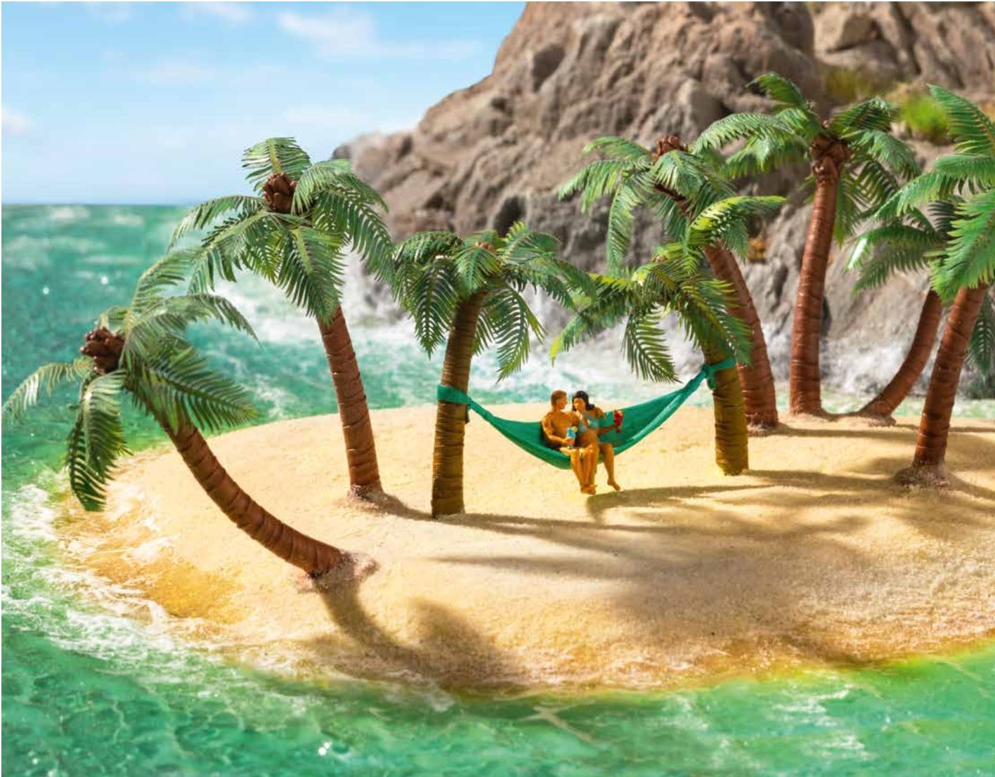 Stellen Sie sich bitte diese Situation vor: Kristallklares Wasser, soweit das Auge reicht; ein Traumstrand mit weißem Sand und sanft plätschernden Wellen. Sie genießen den Moment und sitzen mit Ihrem Schatz auf einer Hängematte, die sich sanft bewegt. Das ist Fernweh und Romantik pur! Das wunderbare Modell besteht aus zwei Palmen mit superealistischen, lasergeschnittenen Palmblättern und einer Hängematte, auf der sich ein