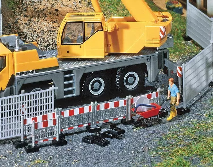 zum Teil bedruckt, mit Standfüßen, zum Absperren von Baugruben und Baustellen aller Art. Hoher Absperrzaun: Gesamtlänge 240 mm. Niederer Absperrzaun: Gesamtlänge 220 mm