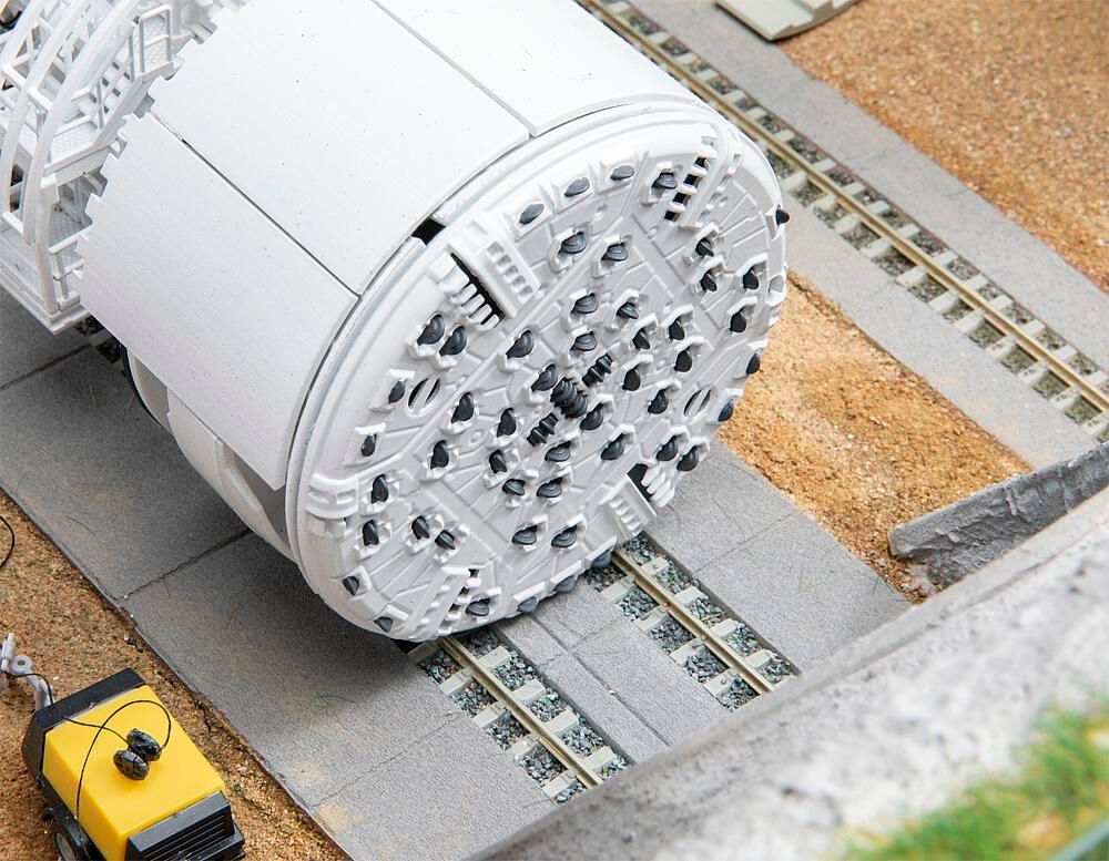Schweres Ladegut für die Szenengestaltung. Bohrschild einer »Gripper-TBM« Tunnelvortriebsmaschine mit Rollenmeißeln und Schälmessern. Auch für den Einbau in ein Diorama zur Gestaltung eines Felsdurchbruches beim Tunnelbau geeignet. Mit dem Getriebemotor, Art. 180722 oder dem Synchron-Bastelmotor, Art. 180629 kann das Bohrschild auch angetrieben werden. Motoren separat erhältlich.