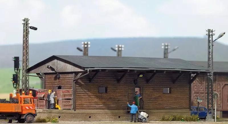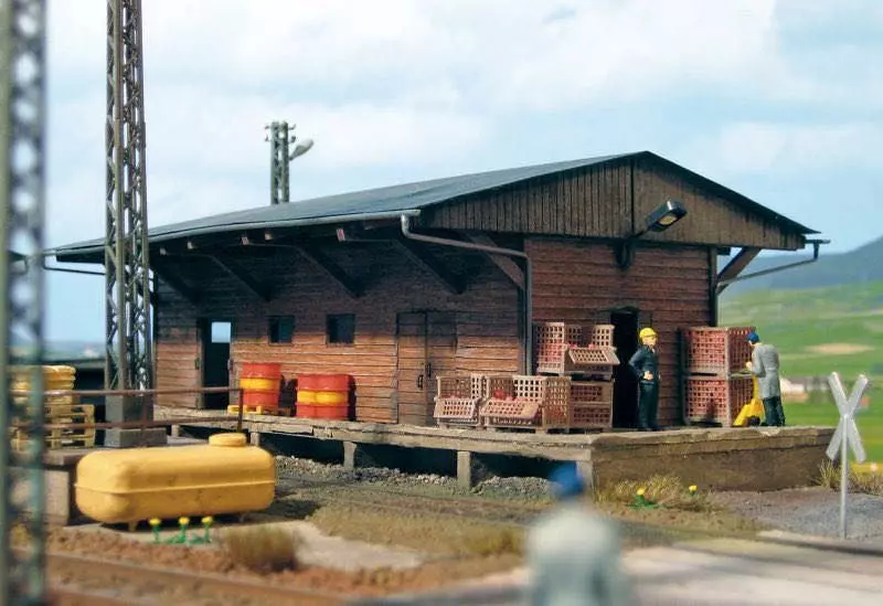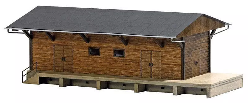 Bausatz für einen Güterschuppen in Holzbauweise nach einem Originalvorbild aus Braunsdorf (bei Chemnitz). Mit Holztoren an beiden Seiten und an einer Stirnseite. Ausführung in farbig gebeiztem Echtholz. Sockel mit Güterrampe und Giebeldach aus natürlichem Werkstoff, Regenrinnen und Fallrohre aus Kunststoff.