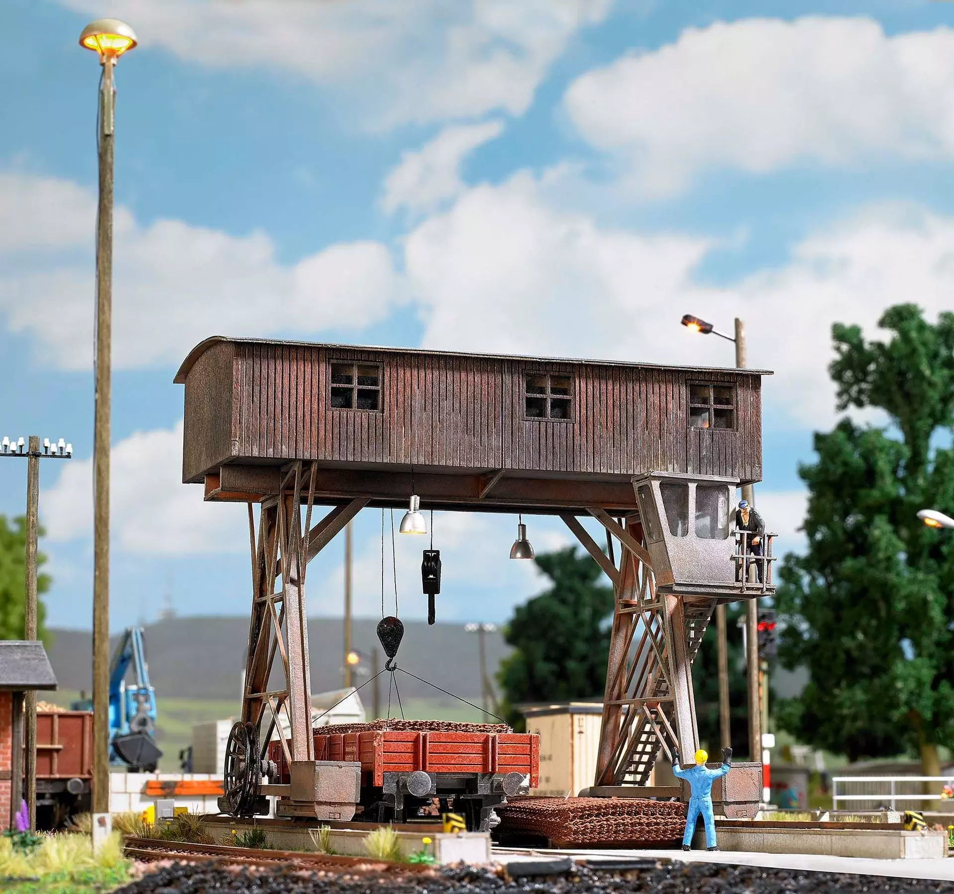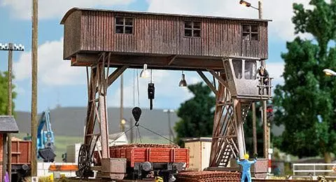 Bausatz eines Portalkranes nach einem Vorbild im sächsischen Zwickau. Der Aufbau aus echtem Holz ist bereits fertig koloriert. Mit Kranführerhaus und filigranen Details wie Sprossenfenster, Treppenaufgang, Rolle für Elektrokabel und zwei Kranhaken. Mit zwei Laufschienen. Standmodell ohne Funktion.