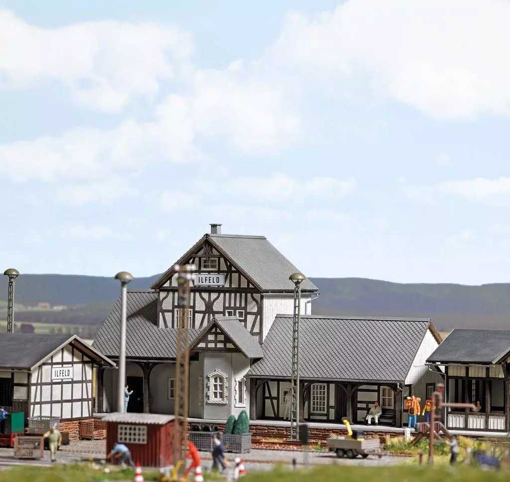 Bausatz für einen Bahnhof nach Originalvorbild in Ilfeld/Harz. Fachwerkbauweise, Holzverkleidung und verputzte Elemente des Gebäudes sind originalgetreu dargestellt. Alle Teile fertig koloriert. Bahnhofsschilder und weitere passende Ausschneidemotiven enthalten. Mit den beiden Bausätzen H0 1641 Wartehalle und H0 1642 Güterschuppen erweiterbar zum kompletten Bahnhofsensemble »Ilfeld«.