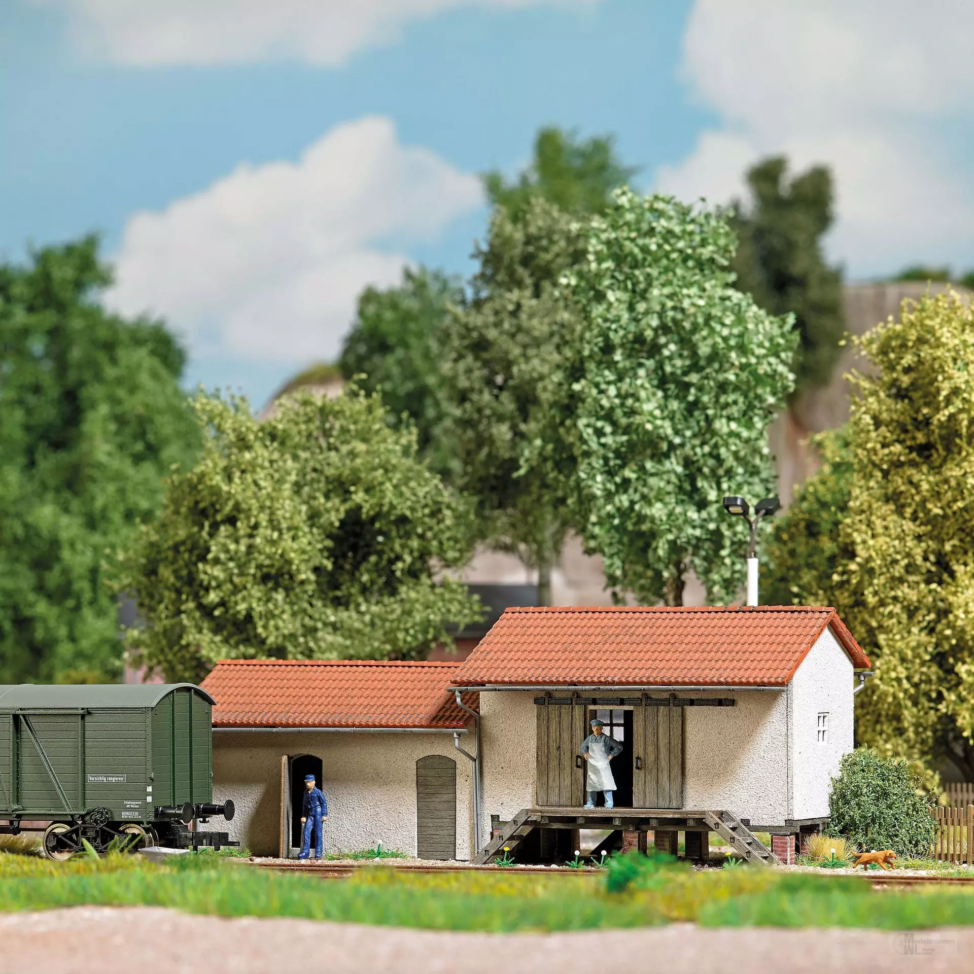 Der Güterschuppen besteht aus einem höheren Gebäudeteil, das auf gemauerten Sockeln aufliegt, sowie einem ebenerdigen Gebäudeteil. Die verputzten Wände sind realistisch dargestellt. Türen, Tore, Fenster, Rampen und der seitlich angebaute Schuppen bestehen aus echtem Holz, das bereits fertig koloriert ist.