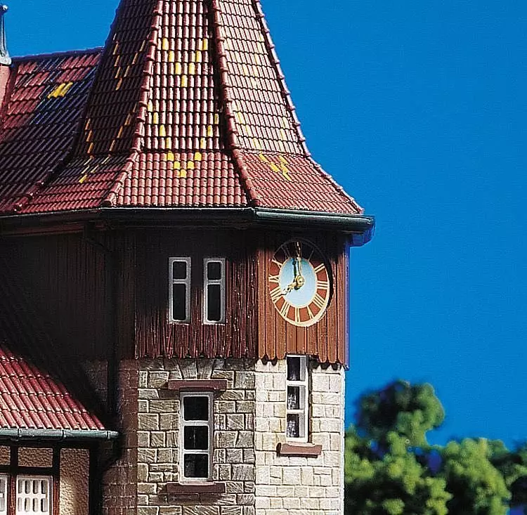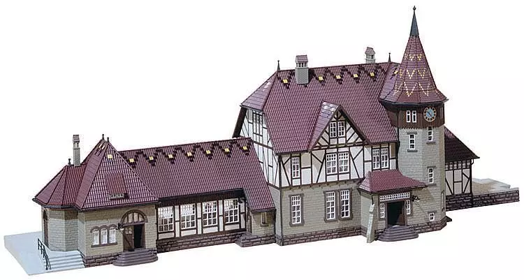 Die um 1900 erbaute Haltestelle »Schwarzburg« ist als Bahnhof der ideale Mittelpunkt einer jeden Modellanlage. Mit Fachwerk, offener, überdachter Bahnsteigwartehalle, reich gegliedertem Walmdach und angebautem Güterschuppen. Mit vielen liebevoll gestalteten Details – so ist der Warteraum komplett ausgestattet, die Türen lassen sich öffnen und im Bausatz befinden sich viele schöne Accessoires rund um das Gebäude.