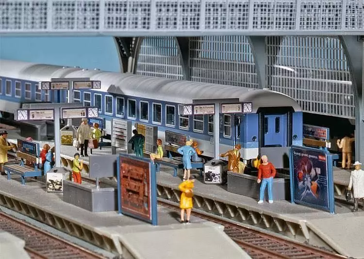 Enthält verschiedene Werbetafeln, Fahrpläne, Bänke, Abfallkörbe, Uhren und Zuglaufanzeigen.