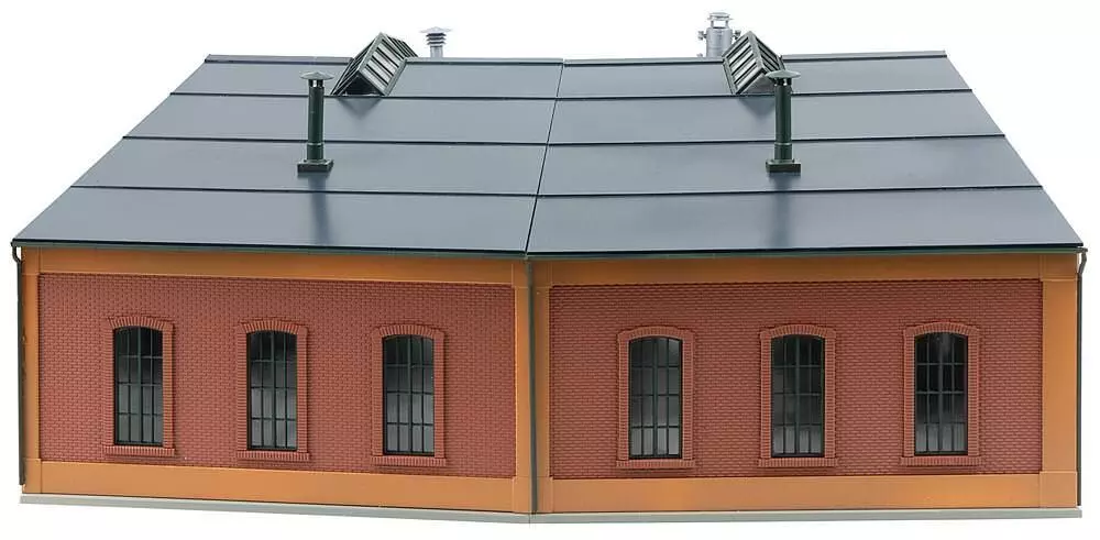 Für das große Bw. 2-ständiger Erweiterungsbau ohne Seitenwände für den »Ringlokschuppen mit 12°-Teilung«, Art. 120281. Jeder Schuppenstand ist mit drei rückwärtigen Fenstern, Rauchabzug, Oberlicht und Schornsteinkopf ausgestattet. Torantriebsteile und Anlenkdraht für den Anschluss an einen Servo enthalten (Servo, Art. 180726 separat erhältlich). Unterstand bis 290 mm LüP. Torhöhe SUK: 72 mm. Modell für alle herkömmlichen Gleissysteme geeignet.