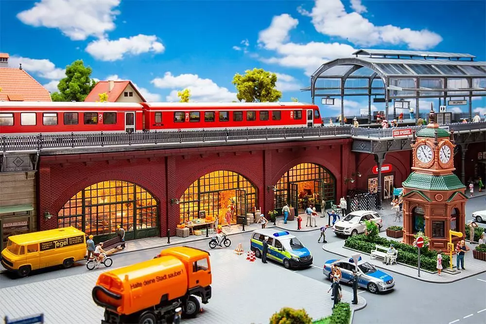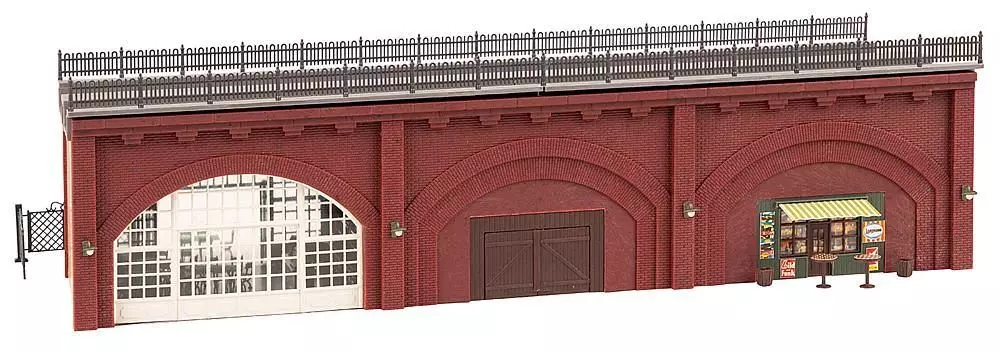 Nach dem Vorbild der Berliner und Wiener Stadtbahnbögen aus dem 19. Jahrhundert. Zweigleisiges Hochbahntrassen-Segment mit rötlicher Sichtziegel-Fassade und drei großflächig verglasten Arkaden, die Gewerbetreibenden als Nutzfläche dienen. Umfangreiches Zubehör für die Ausstattung eines Obst- und Gemüsehandels, eines Cafés und eines Antiquitätenhandels in den Gewölben liegen bei. Trassierung für alle Gleissysteme geeignet.