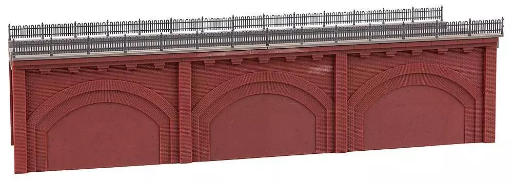 Nach dem Vorbild der Berliner und Wiener Stadtbahnbögen aus dem 19. Jahrhundert. Zweigleisiges Hochbahntrassen-Segment mit rötlicher Sichtziegel-Fassade und drei zugemauerten Viaduktbögen. Für alle Gleissysteme geeignet.