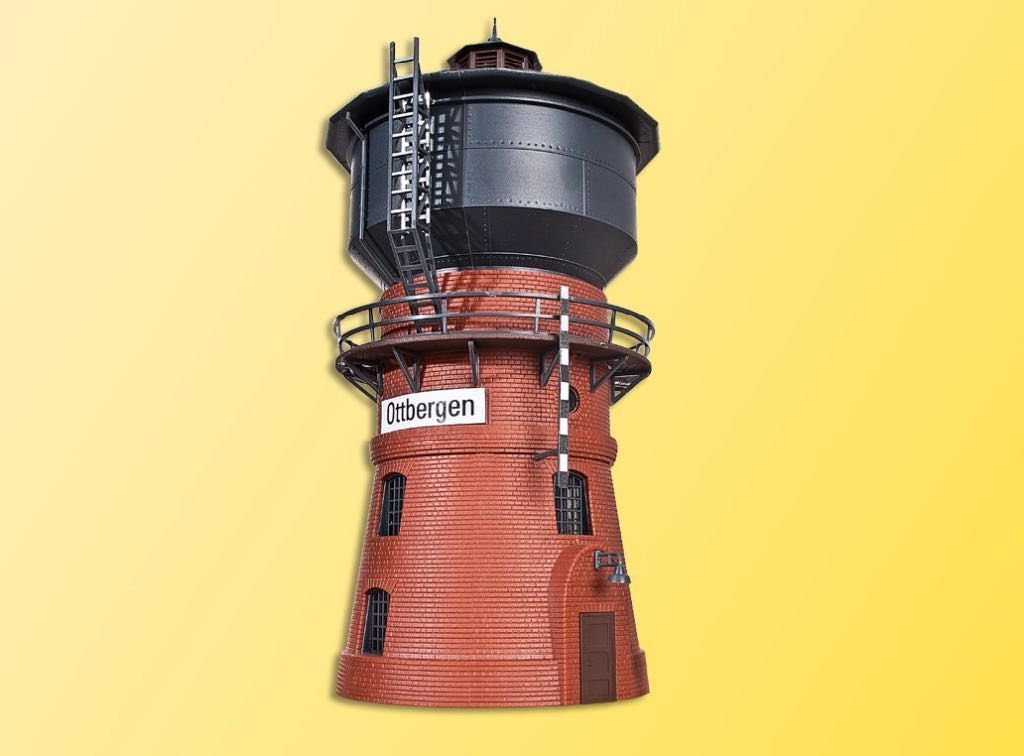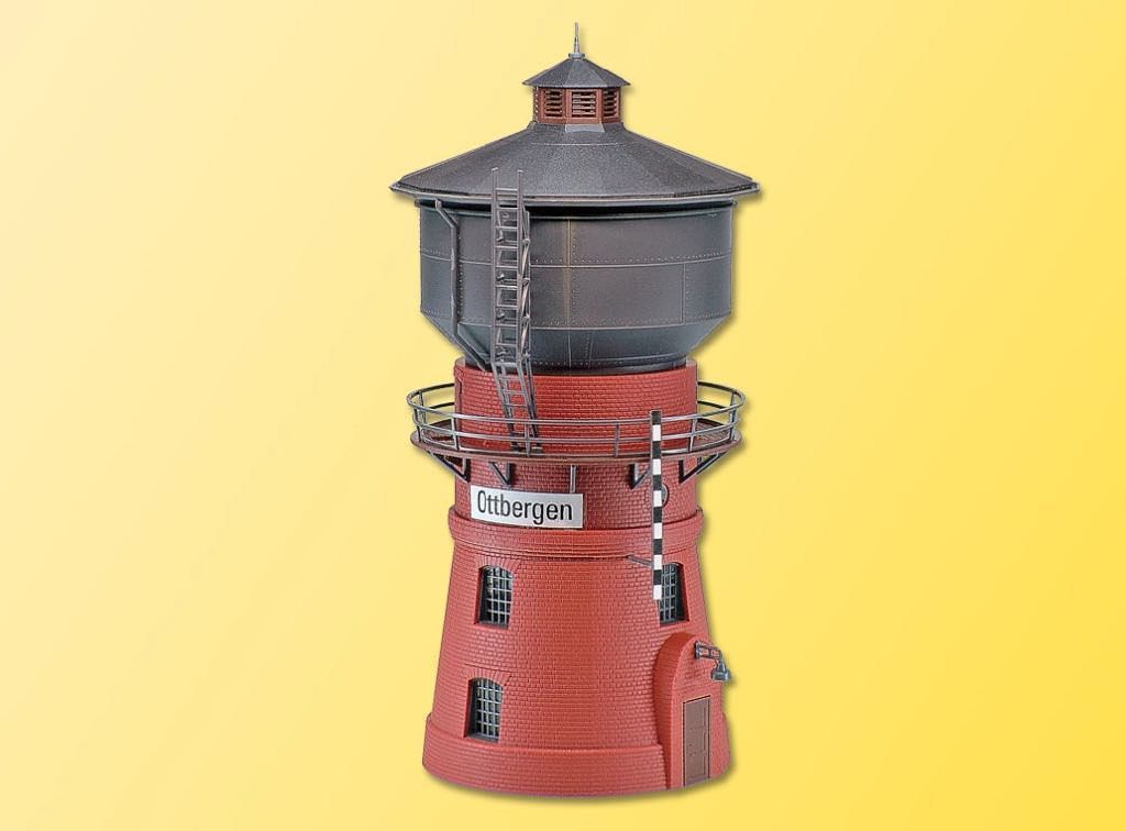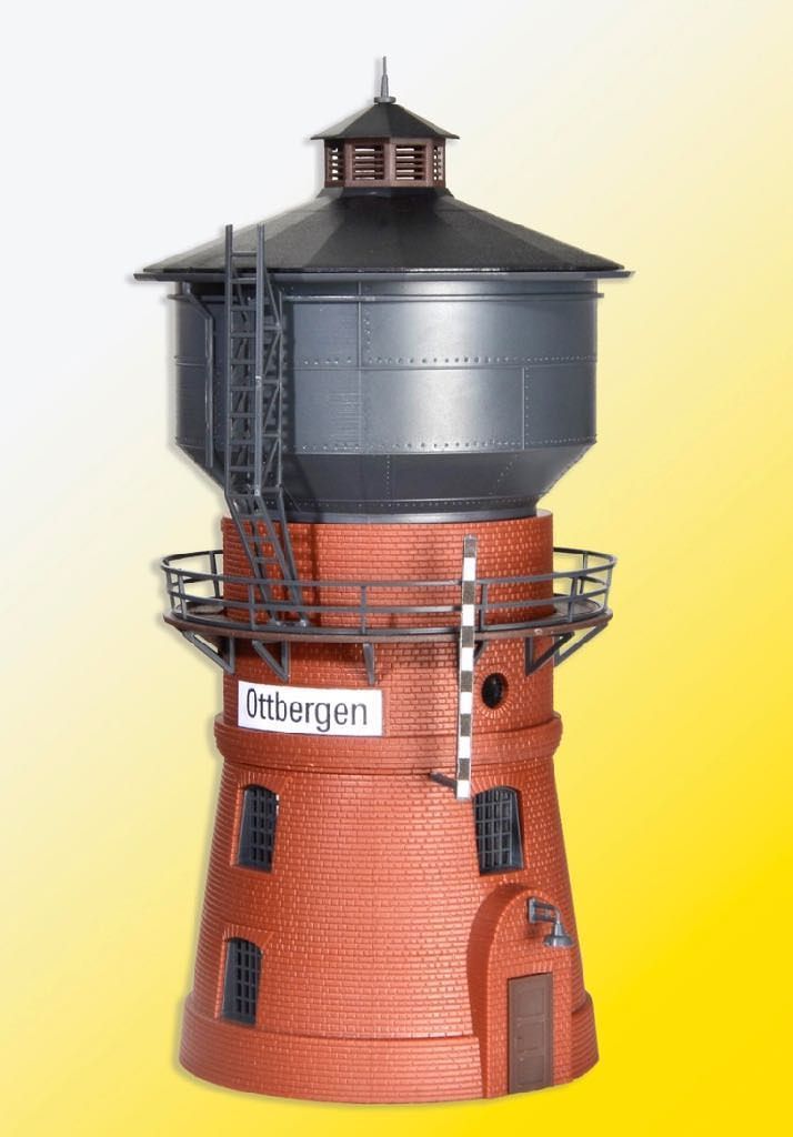 Bausatz. Das Bahnbetriebswerk Ottbergen war zwar ein eher kleines BW, dafür aber ein sehr bekanntes und beliebtes in der Geschichte der Dampflokzeit. Jahrzehntelang wirkte es ortsbestimmend im Weserraum. Im BW Ottbergen stand das Vorbild dieses kibri Wasserturmes. Mit seinem rötlich gehaltenen Backsteinmauerwerk, dem nach unten breiter werdenden Erdgeschoss und dem Umlauf, von dem eine Leiter auf das Dach und die Behälterentlüftung hinaufführt, ist er einer jener typischen Wassertürme, wie sie in vielen BWs vor und nach der Jahrhundertwende errichtet wurden. Hauptbestandteil ist der Wasserbehälter, der ein Fassungsvermögen von 130 m³ hatte. Maßstäblich gelungen verkleinert, sollte er auf jedem Modellbahn-Dampf-BW stehen. Maße: Ø 9,5 x H 20 cm. Schwierigkeitsgrad: 2 (Fortgeschrittene).