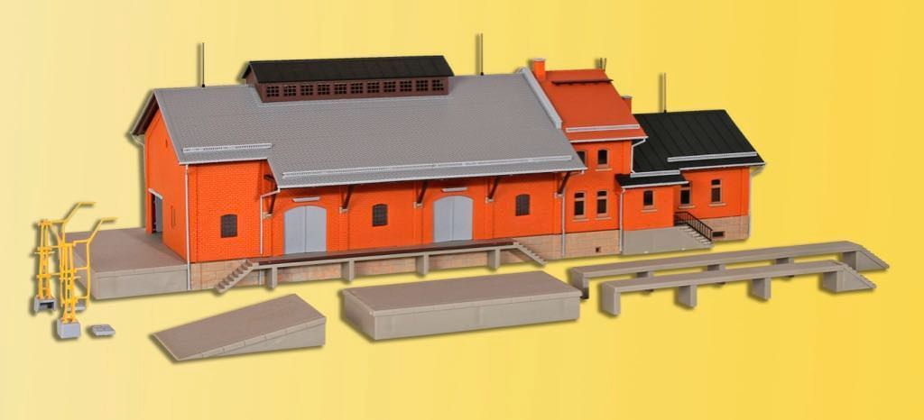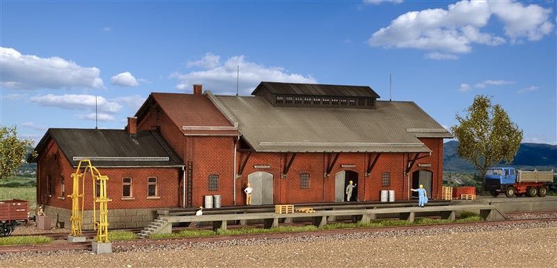 Bausatz. Der Güterumschlag ist ein fester Bestandteil der Eisenbahn. Diese Halle eignet sich zur Unterbringung von Gütern aller Art. Die Rampenteile können flexibel aufgebaut werden. Das Lademaß dient der Kontrolle, ob ein Güterwagen überladen hat. Maße: L 47 x B 19,5 x H 15 cm. Schwierigkeitsgrad: 2 (Fortgeschrittene).