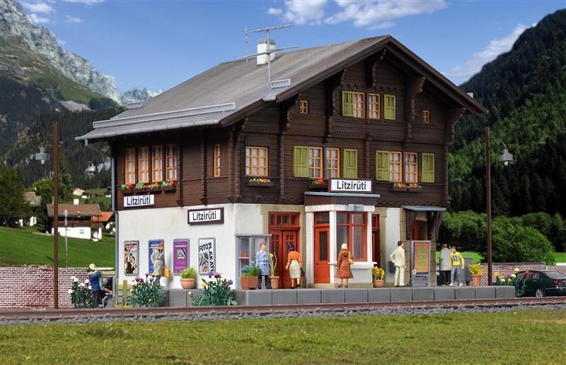 Funktionsbausatz. Verkehrstechnisch erschlossen wird die Litzirüti durch die Arosabahn, die am 12. Dezember 1914 eröffnet und 1942 der Rhätischen Bahn angegliedert wurde. Mit der Eröffnung wurde 1914 auch der Bahnhof Litzirüti eingeweiht. Er besitzt zwei Durchfahrgleise und ein Stumpengleis. Das Bahnhofsgebäude ist im typischen Chaletstil der Region gehalten. Die passende LED-Beleuchtung für ein Fenster liegt dem Bausatz bei. Sie ist einfach zu montieren und genau auf das Modell abgestimmt. Maße: L 16 x B 14 x H 14 cm. Schwierigkeitsgrad: 2 (Fortgeschrittene).