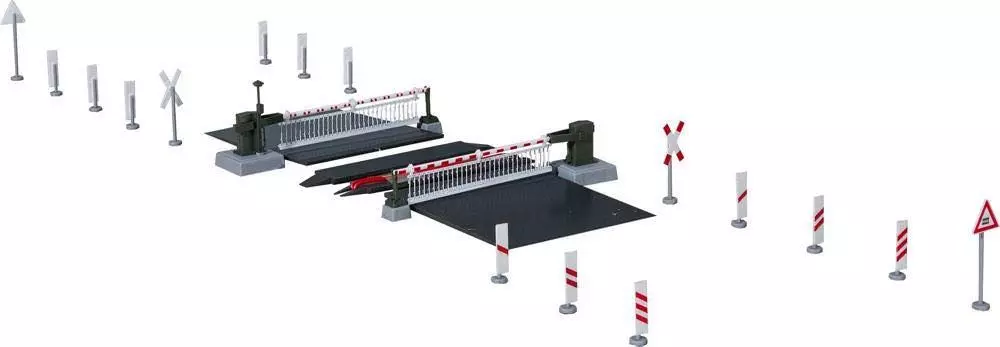 Bahnübergang mit 2 Bahnschranken, angetrieben durch 2 getrennte Unterflur-Antriebe. Ausgestattet mit filigranem Behang und Läutewerkattrappe. Die Antriebe ermöglichen vorbildgetreu langsames Öffnen und Schließen der Schranken mit 2 Geschwindigkeiten. Die Straße kann über beliebig viele Gleise führen. Gleisfüllstücke, Auffahrrampen sowie bedruckte Verkehrszeichen liegen bei. Der integrierte Digitaldecoder ist multiprotokollfähig und versteht die Formate DCC und MM. Für den automatischen Betrieb sind Schaltgleise bzw. die Schaltkontakte Art. 6840 erforderlich. Bei zweigleisiger Strecke benötigen Sie zusätzlich das elektronische Relais Art. 5552. Informationen zum Einsatz bietet das Viessmann Signalbuch Art. 5299. Zum Aufbau einer vierschlägigen Schranke benötigen Sie zusätzlich Art. 5107 mit gespiegelter Bedruckung. Weitere Gleisfüllstücke sind unter Art. 5105 (Zweileitergleis) und 5106 (Mittelleitergleis) erhältlich. Länge eines Schrankenbaumes: ca. 6,3 cm.