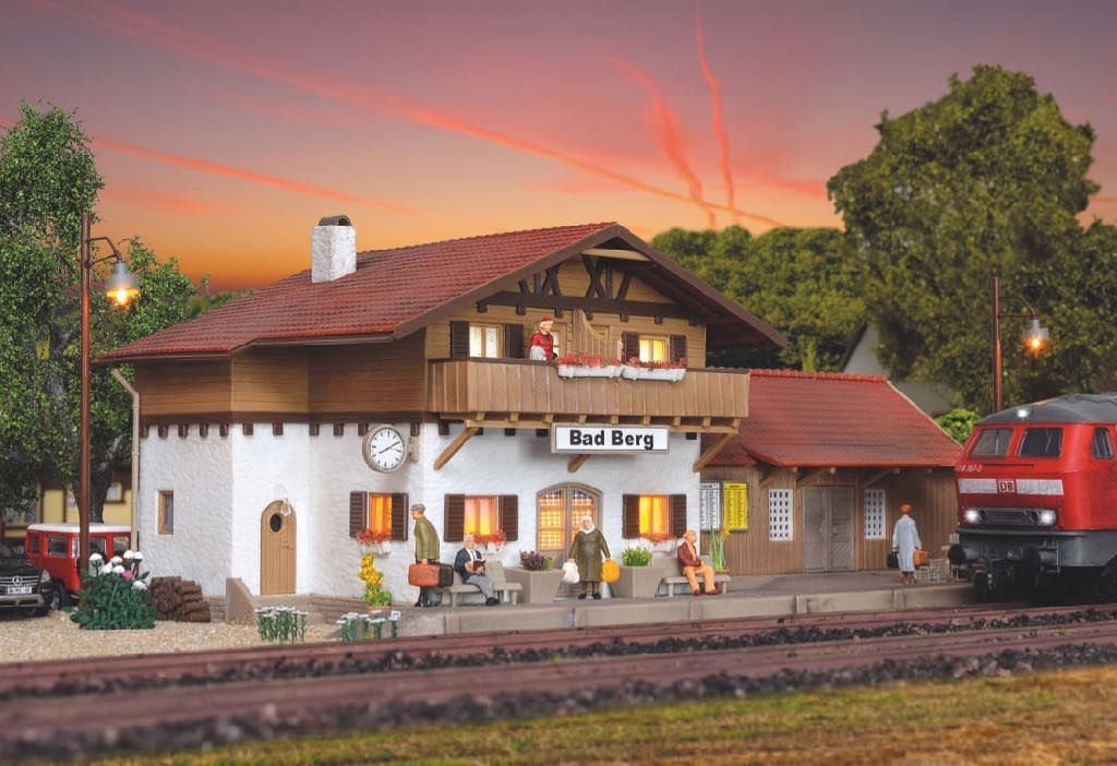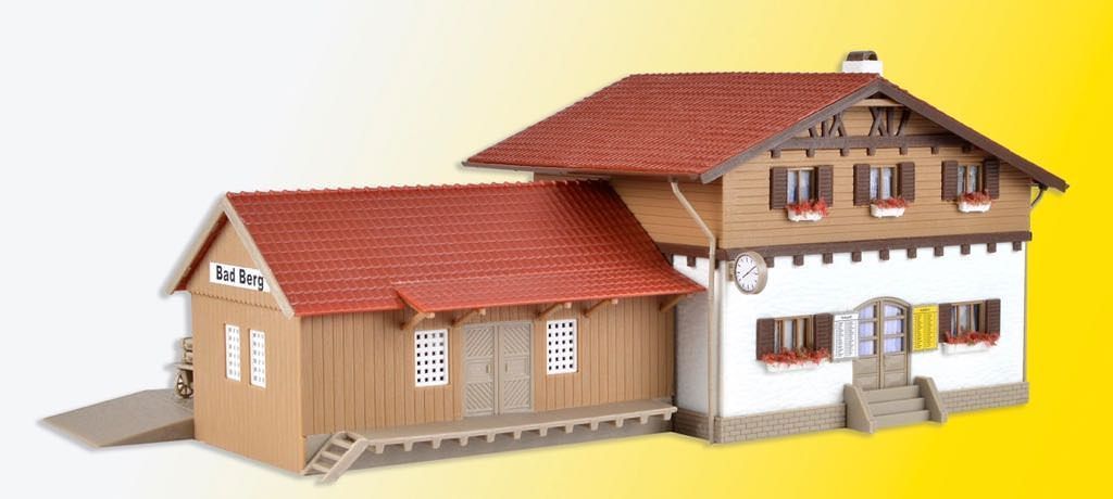 Der Bahnhof Bad Berg ist ein lieblicher, ländlicher Bahnhof, der die Urlaubstimmung in greifbare Nähe rückt. Lagerschuppen und Bahnsteig sind integriert. Er besticht durch Anmut und ein sehr gutes Preis-Leistungsverhältnis. Maße: L 24 x B 12,5 x H 9,5 cm.