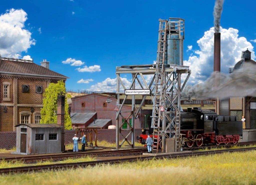 Zur Anlage gehören der Besandungsturm, eine Wellblechhütte und eine Halterung für Arbeitsgeräte. Durchfahrtshöhe: 6,5 cm, Durchfahrtsbreite: 5 cm. Maße: L 8 x B 7,5 x H 15 cm, L 6,7 x B 2,5 x H 7 cm, L 4,7 x B 1,3 x H 2,8 cm.