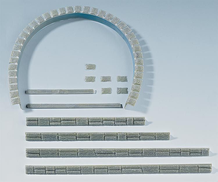Plastikteile für den individuellen Bau von Tunnelportalen, in Verbindung mit Mauerplatten.