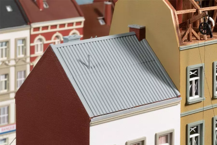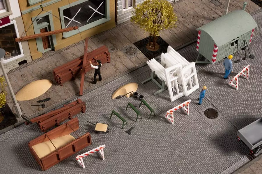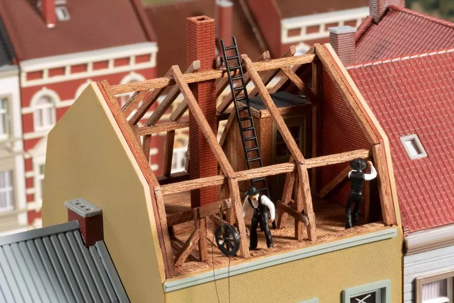 Das zweite Gebäude wird gerade saniert. Die Fensterscheiben sind zur Sicherheit mit weißen Kreuzen bemalt, als Zeichen, dass Glasscheiben drin sind! Die Zimmerleute arbeiten am Dachstuhl. Material wird mit einem Seilzug nach oben befördert. Als Ausstattung liegen dem Bausatz viele Baustellen-Utensilien bei: Holzstapel, Böcke, Fenster, Werkzeug aller Art und eine Kiesschütte aus dicken Holzbohlen. Am Modell des Bauwagens sind Warnecken aufgedruckt