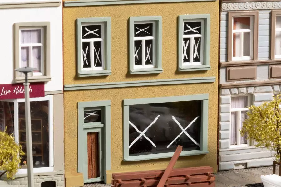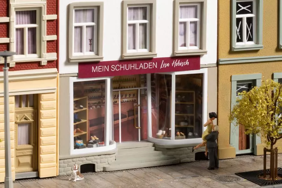 Die Stadthäuser der Schmidtstraße finden sich seit Jahren auf vielen Modellbahnanlagen. Der Straßenzug wird nun wieder etwas länger. Auf Anregung einer AuhagenSeminarteilnehmerin entstand ein Haus mit Schuhgeschäft. Besonderer Blickfang ist die Innenausstattung des Geschäfts und die Gestaltung des Eingangs mit gebogenen Schaufenstern. Für Abwechslung in der Schmidtstraße sorgt das graue Dach.