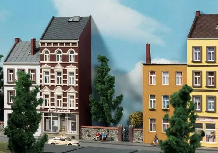 Die Halbreliefhäuser passen ideal zu unseren herkömmlichen Stadthäusern der Schmidtstraße. Sie sind das Bindeglied zum Anlagenhintergrund und sparen Platz. Die in beliebiger Reihenfolge aufstellbaren