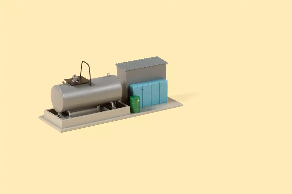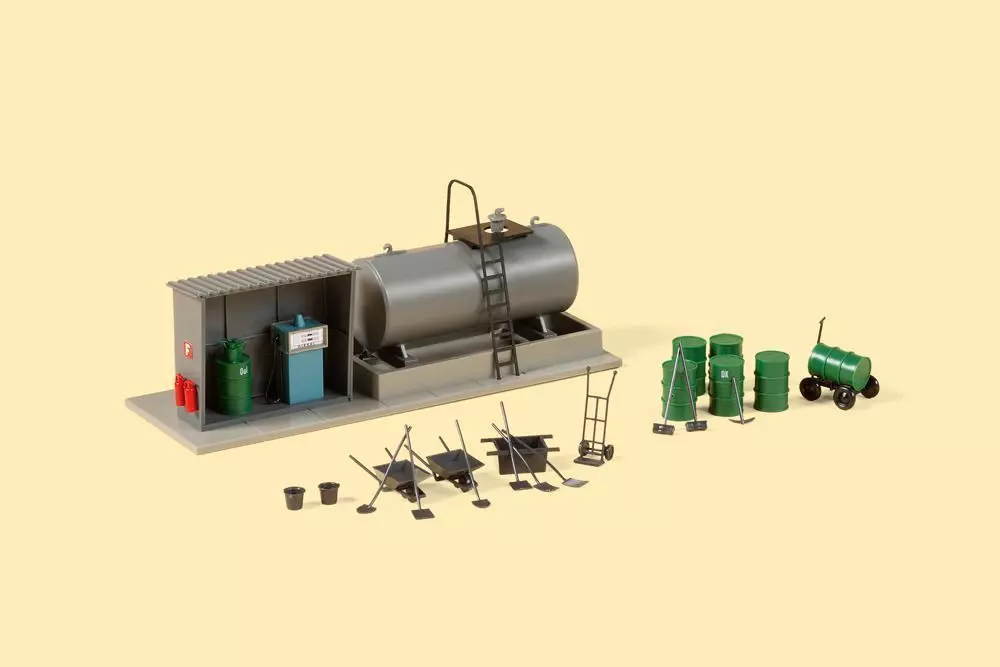 Der ab den 1930er Jahren beginnende Einsatz von Kleindiesellokomotiven im Rangierdienst auf Bahnhöfen oder auch in Industriebetrieben erforderte die entsprechenden Behandlungsanlagen. Das authentische Modell einer in den 60er Jahren modernisierten Tankanlage mit Kraftstoffkessel, wettergeschützter Tanksäule, Ölvorratswagen und Schmierstofflager lässt sich ideal mit unserem Artikel 11 429 Kö-Schuppen kombinieren.