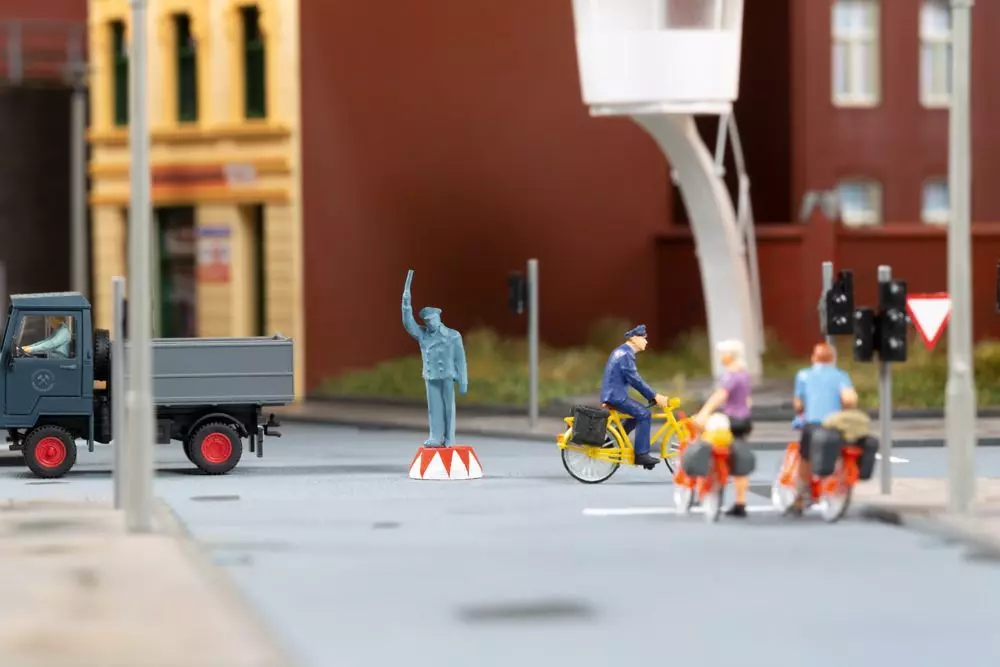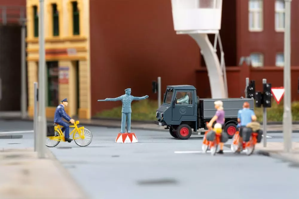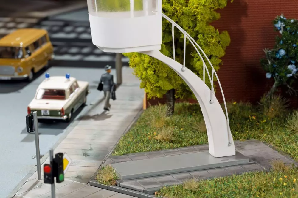 Die stark zunehmende Massenmotorisierung in den 1960er Jahren erforderte an neuralgischen Verkehrsknotenpunkten in Großstädten eine sichere Verkehrsüberwachung und -regelung. Zur Beobachtung und Steuerung des Verkehrs dienten solche Türme. Vom Vorbild unseres Modells konnte bedarfsgerecht manuell in die Steuerung der Lichtsignalanlagen des Straßenbahn-, des Oberleitungsbus- sowie des PKW-Verkehrs eingegriffen werden. Bei einem Ausfall der Technik erfolgte die Verkehrsregelung konventionell durch einen Verkehrspolizisten auf einem Podest in Kreuzungsmitte. Beide Szenarien können mit passenden, beiliegenden unbemalten Figuren nachgestellt werden.