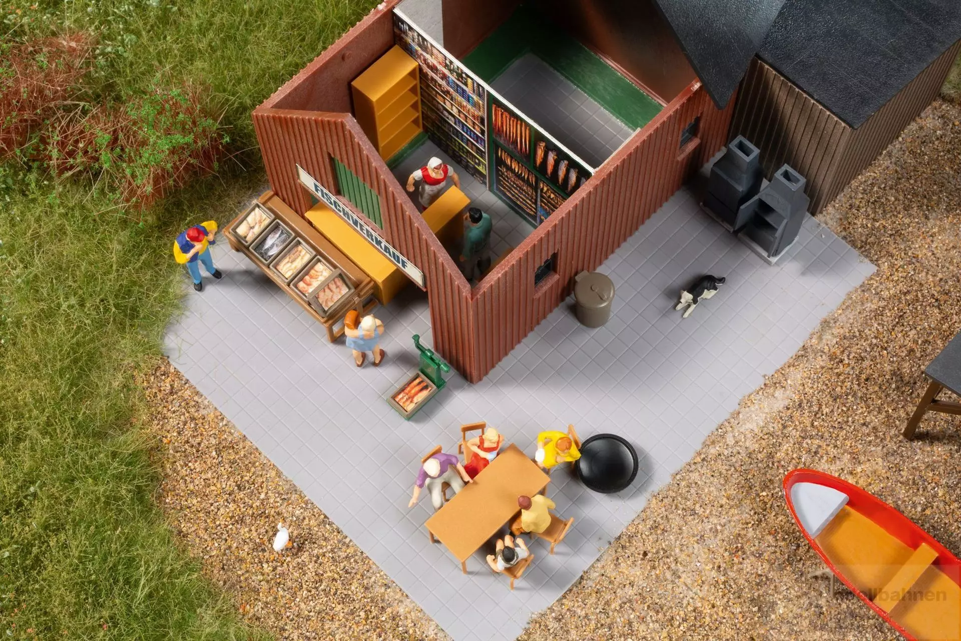 Ein kleineres, holzverschaltes Nebengebäude mit Anbau beherbergt passend zum Artikel 11 474 und 11 476 einen Fischverkauf. Die mit Tresen, Regalen, Auslagen und einer Waage eingerichtete Verkaufsstelle bietet dank der beiden Räucheröfen auch eine Vor-Ort-Verkostung an. Dafür stehen Sitzgelegenheiten zur Verfügung. Weitere Dekorationen, auch anderer zu verkaufender Waren, eine Feuerschale und Mülltonnen runden den Bausatz ab.