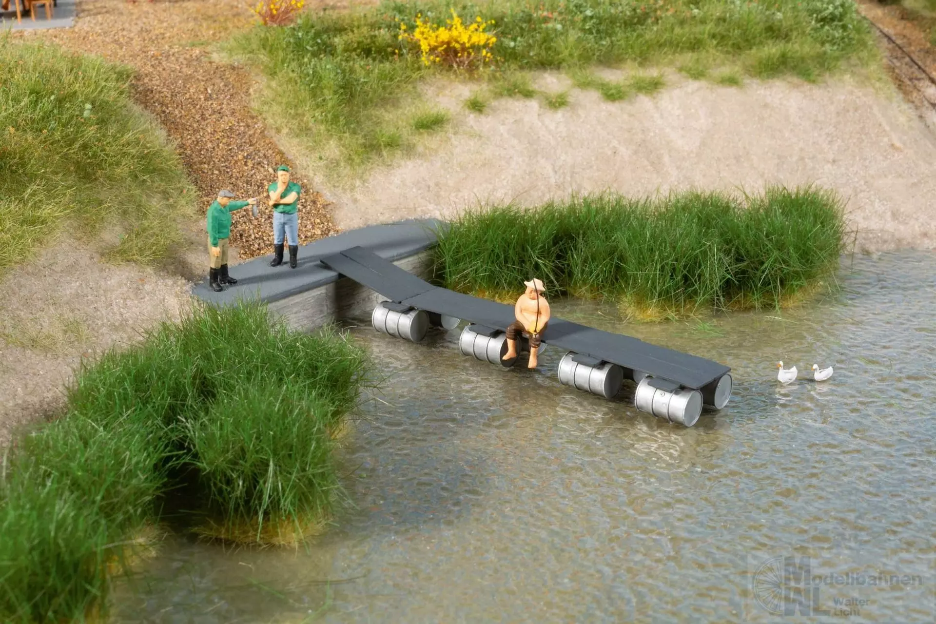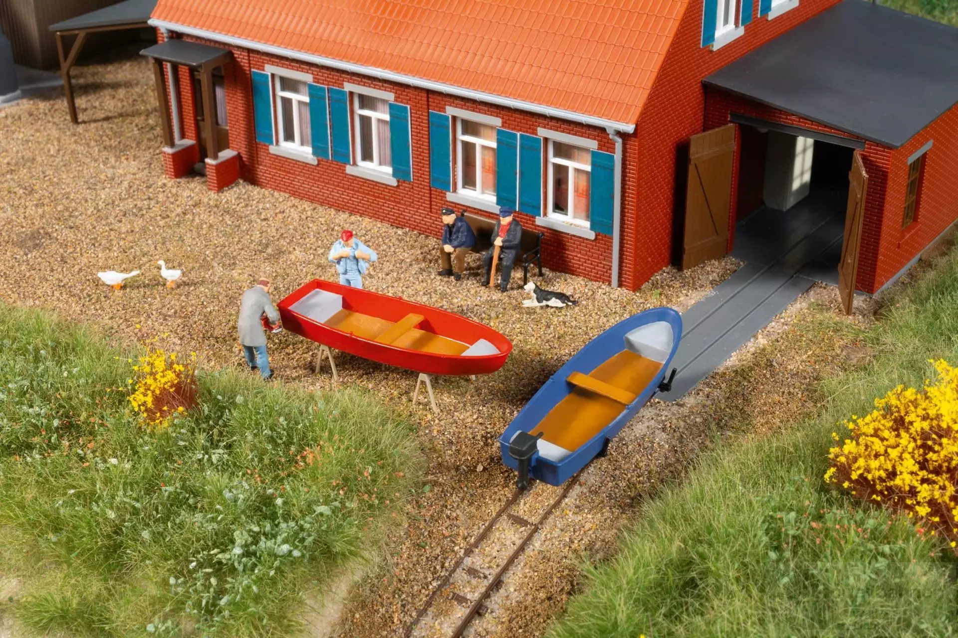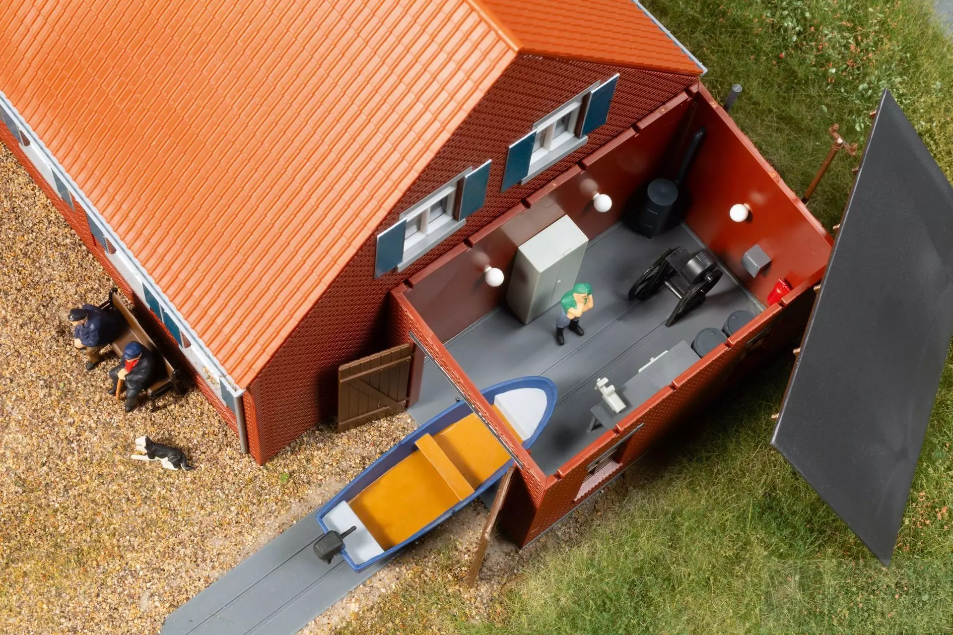 Kleines gemauertes Bootshaus mit Inneneinrichtung: Ein Ofen, Schränke, Böcke, eine Werkbank sowie eine Windenanlage (ohne Funktion), mit deren Hilfe Boote mittels Aufzugswagen auf Gleisen zu Wasser gelassen werden können. Zur weiteren Ausgestaltung der Wasserfläche sind Teile für die Nachbildung eines schwimmenden Bootssteges enthalten. Dieser Steg sowie die beiden farblich unterschiedlichen Boote (eins mit Außenbordmotor) sind Wasserlinienmodelle.