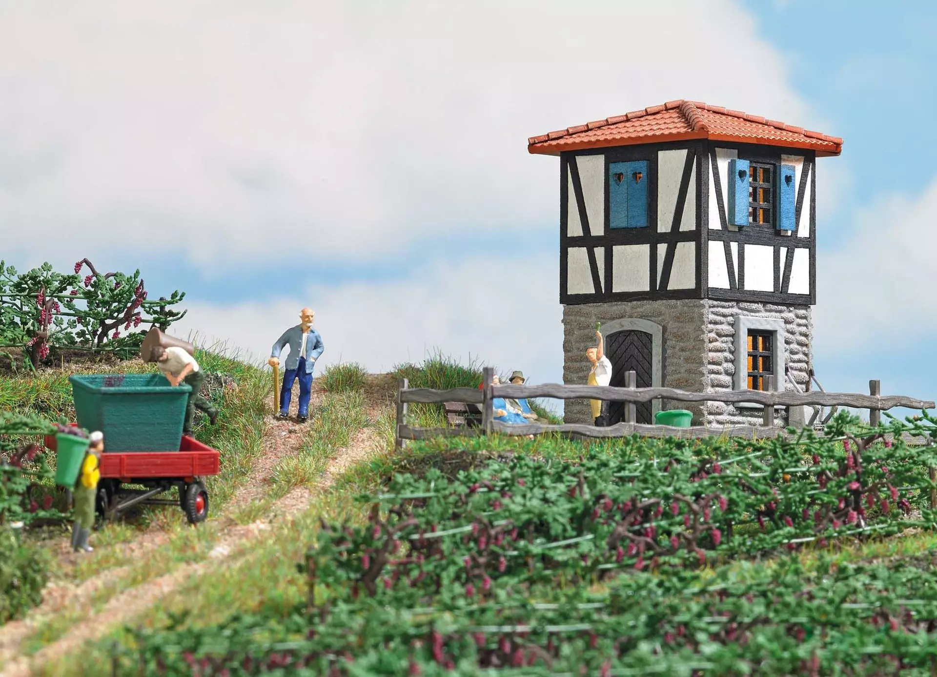Typisches Weinberghäuschen nach einem Vorbild aus Bensheim an der hessischen Bergstraße (www.bensheim.de). Fachwerkbauweise im Obergeschoss mit echten Holzelementen. Untergeschoss mit realistischer Nachbildung aus Naturstein. Alle Teile des Bausatzes sind fertig koloriert.