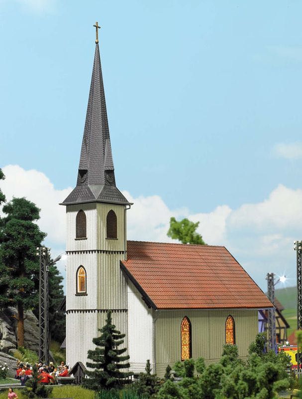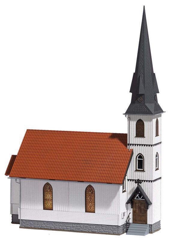 Bausatz für ein Modell der kleinsten Holzkirche Deutschlands. Das Vorbild steht in der Ortschaft Elend im Harz und wurde 1897 als Kirche eingeweiht. Wie im Original sind auch im Modell die Wände aus echtem Holz gestaltet. Das Dach, die Regenrinnen und Fallrohre bestehen aus Kunststoff. Die farbig bedruckten Fensterscheiben kommen durch eine zusätzliche Innenbeleuchtung (z.B. mit Busch Beleuchtungsset 4280) besonders gut zur Geltung.
