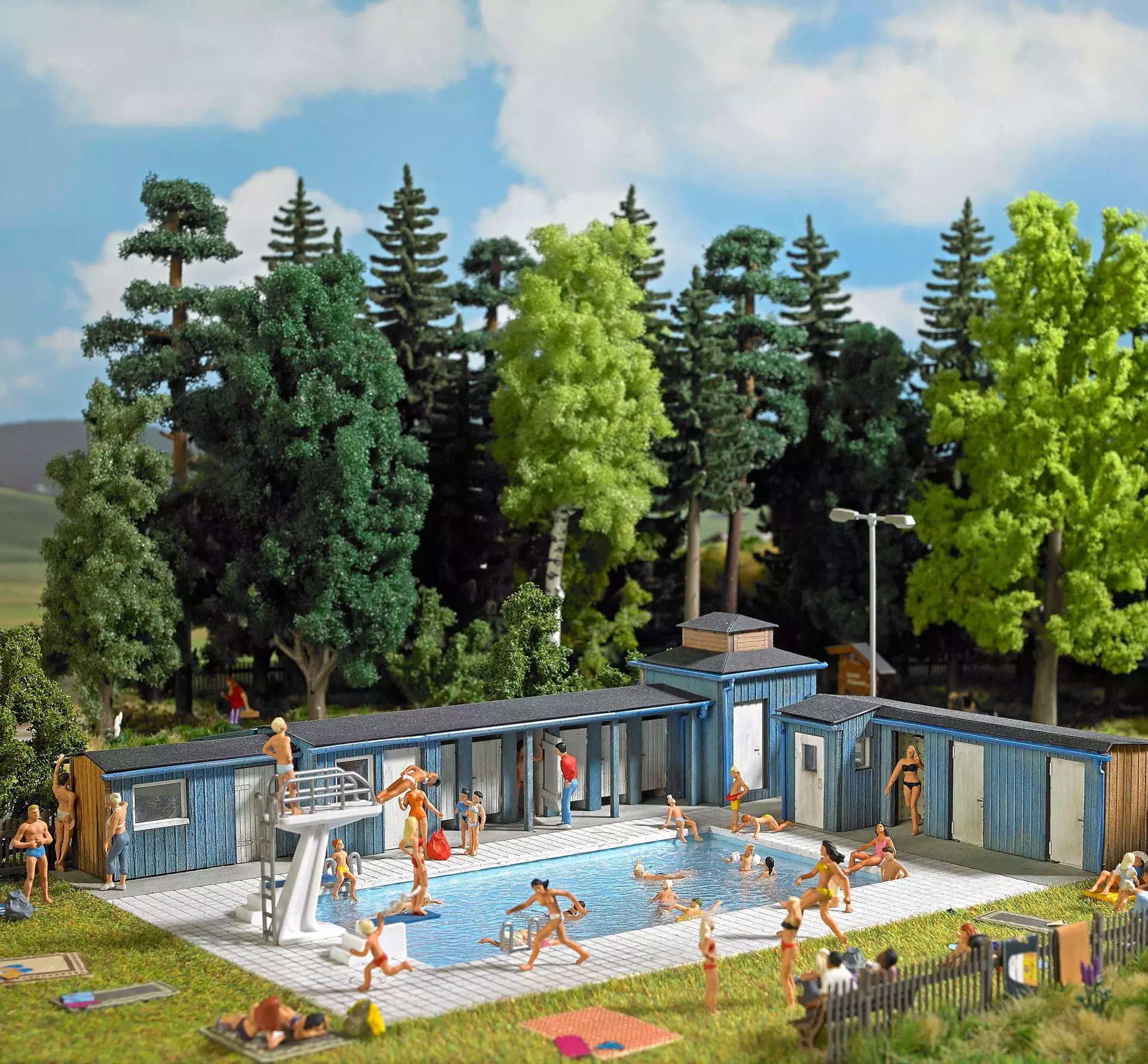 Komplettes Freibad in Holzbauweise mit Kassenhaus und filigranem Metalltor, Umkleidekabinen, Duschen, Toiletten, Betriebsräumen, Bademeisterkabine und Geräteschuppen. Bereits farbig koloriert. Großes Schwimmbecken mit realistischer Wasseroberfläche, Sprungtürmen, Liegewiese und Umzäunung. Bausatz in Anlehnung an das noch existierende Freibad in Mylau in Sachsen.
