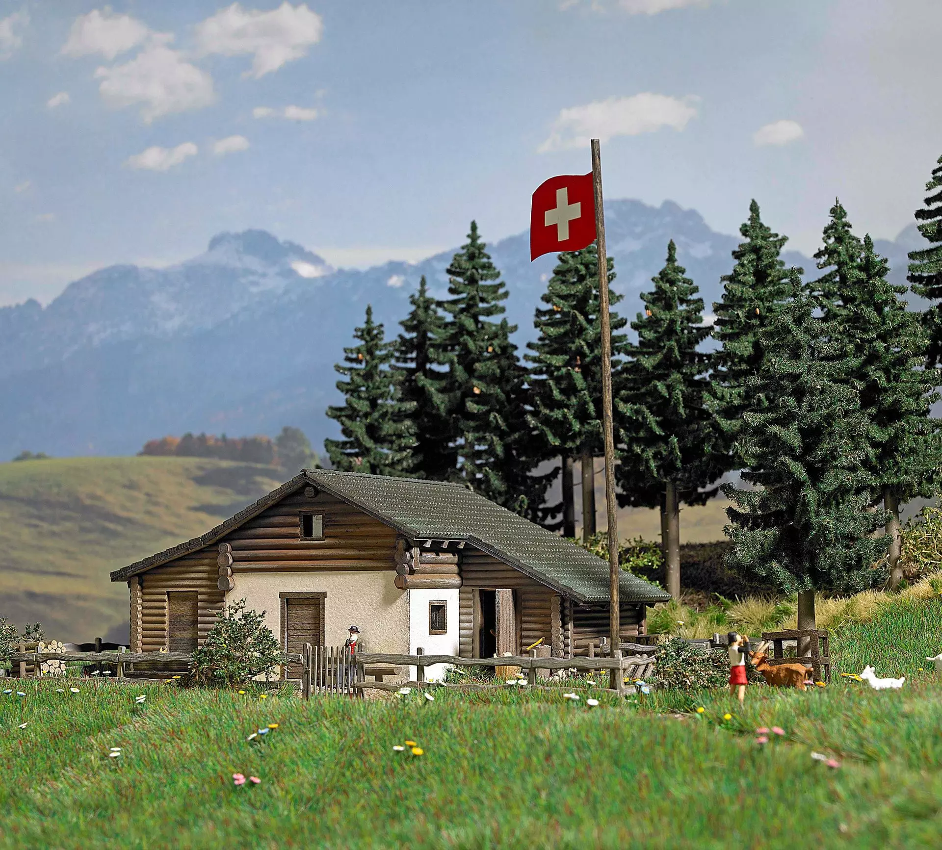 Bausatz für eine größere Almhütte mit angebautem Geißenstall nach dem Originalvorbild auf der Heidialp (www.heididorf.ch). Blockbohlenbauweise in Kunststoff. Holzverkleidung auf der Rückseite, Fenster und Türen aus echtem Holz. Alle Teile sind bereits fertig koloriert. Universell als ländliches Gebäude einsetzbar.