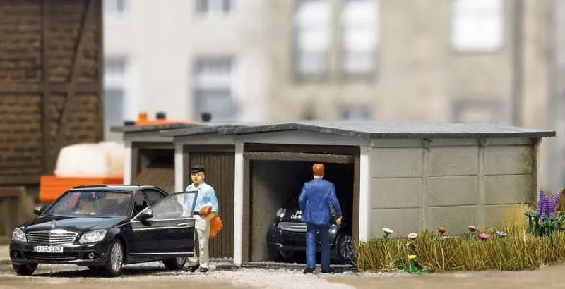 Modell einer ostdeutschen Normgarage. Ähnliche »Fertiggaragen« findet man aber auch in den alten Bundesländern, so dass die Garage universell eingesetzt werden kann. Nachbildung der Betonplattenwände und Boden aus Kunststoff. Bausatz.