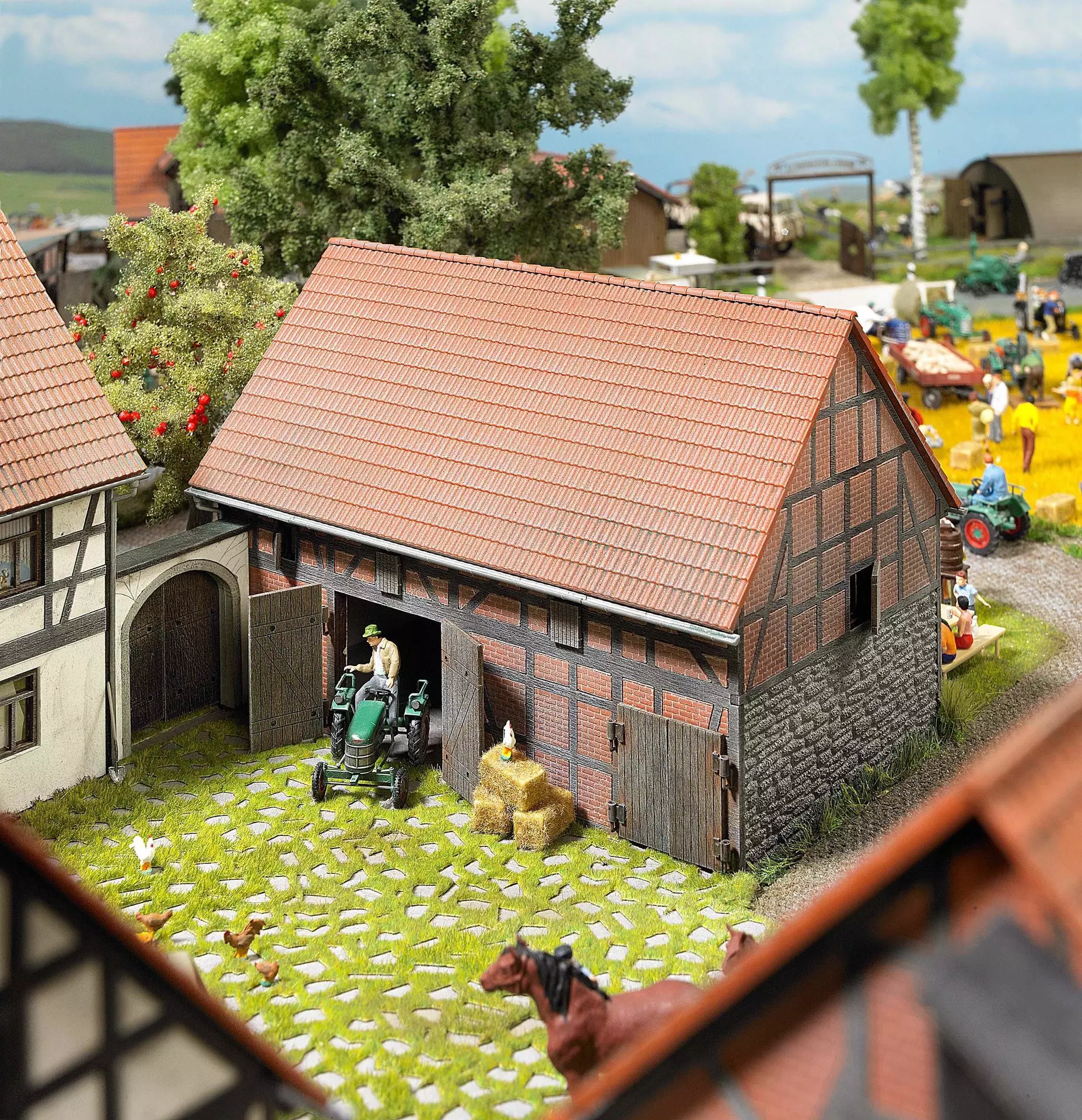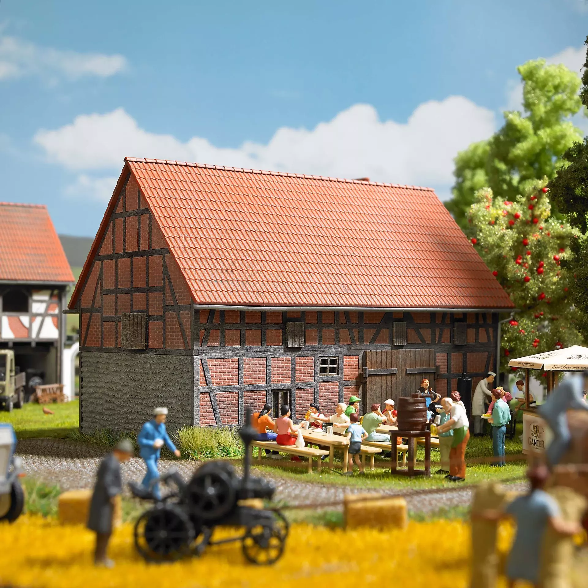 Ziegel-/Fachwerkbauweise an Vorder- und Rückseite des Gebäudes, eine Seite mit Natursteinsockel, die andere Seite mit Schindelverkleidung des Dachgiebels und Putzsockel. Einfahrten mit Toren zum Öffnen (2x: 28 x 28 mm, 1x: 20 x 21 mm). Bausatz.