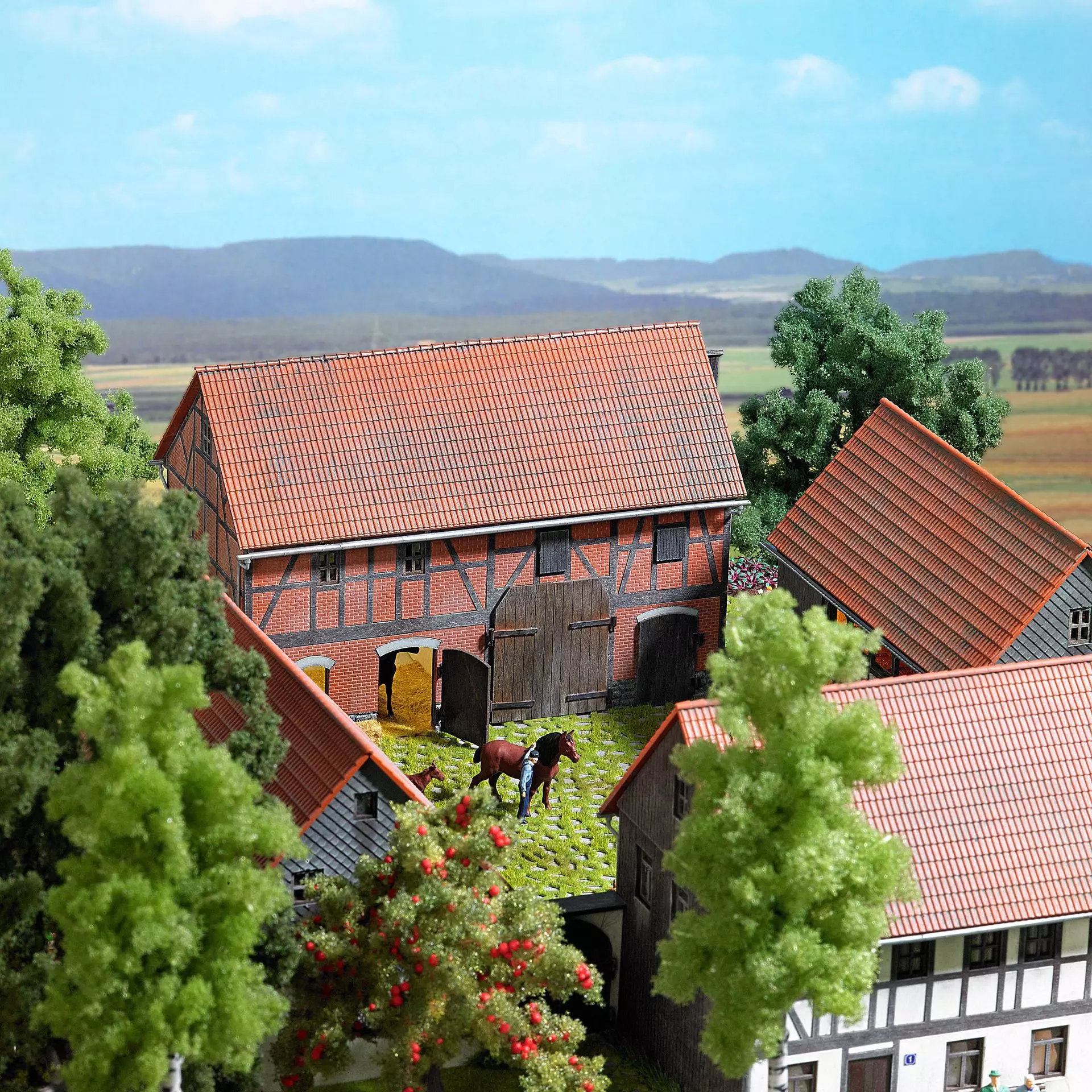 Großer Stall bzw. Heuboden in Ziegel/Fachwerkbauweise mit rundum laufenden Natursteinsockel in verschiedenen Höhen. Große Durchfahrt (35 x 40 mm) mit Holztoren zum Öffnen an zwei Seiten des Gebäudes, 4 Stalltüren in unterschiedlichen Größen, Belüftungsturm an einer Kopfseite des Stalls. Bausatz.