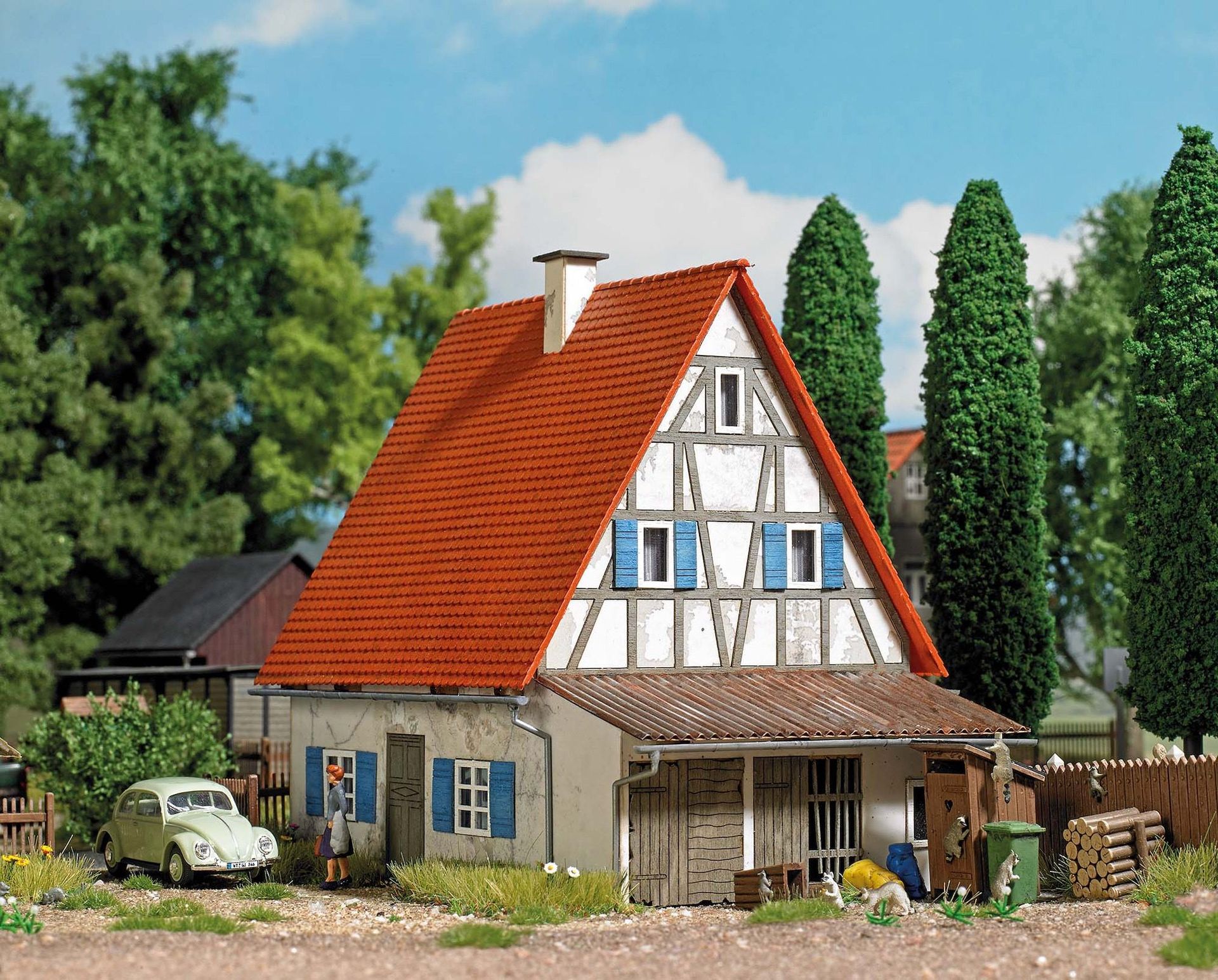 Der verwitterte Putz dieses alten Fachwerkhauses ist in super-realistischer 3D-Optik ausgeführt. Die matte Oberfläche hat einen modellgerecht rauen Charakter in Optik und Haptik. Fachwerk, Fensterläden, Türen und Tore sind aus echtem Holz. Mit filigranen Regenrinnen und Fallrohren aus Kunststoff. Alle Teile fertig koloriert. Beleuchtbar mit Busch LEDs 5998. Bausatz.