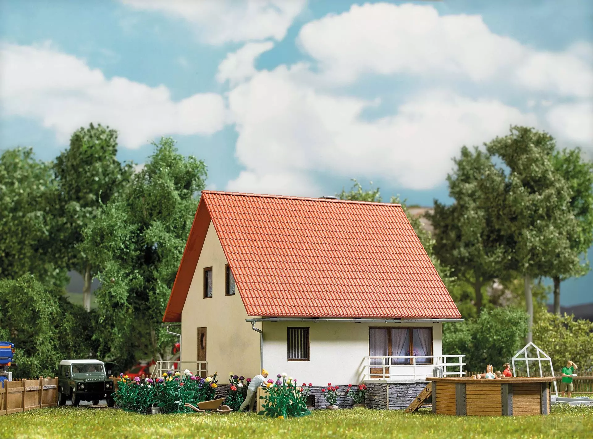 Bausatz für ein typisches Wohnhaus mit verputzter Fassade und Natursteinsockel. Mit Treppenaufgang an der Stirnseite und Terrasse an einer Längsseite des Gebäudes. Türen und Fensterrahmen aus echtem Holz, bereits fertig koloriert. Filigrane Geländer, Regenrinnen und Fallrohre. Realistisches Ziegeldach.
