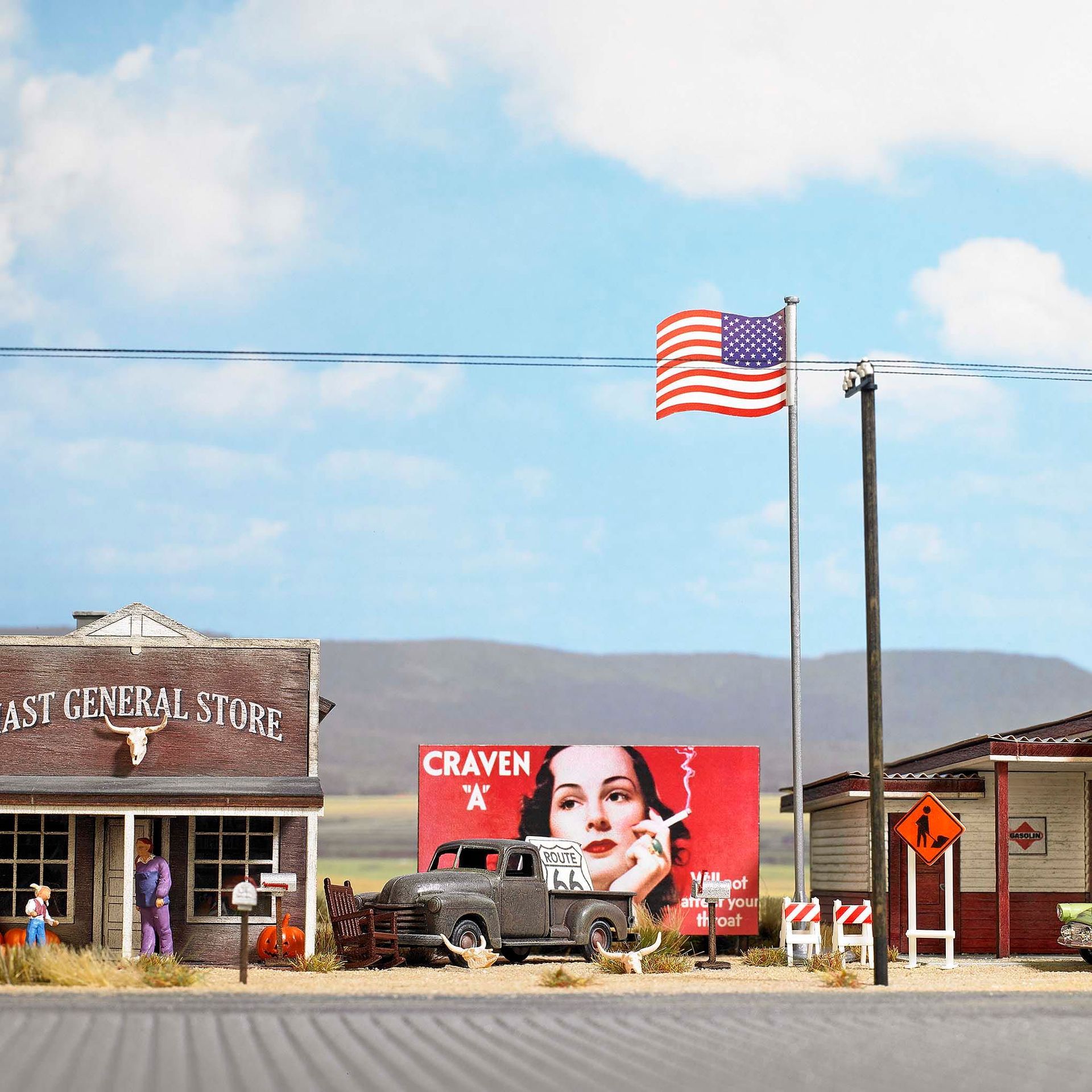 Nostalgisches Zubehör, das den »American Way of Life« symbolisiert: große Highway-Werbetafeln aus Holz, Baustellenschilder und -absperrungen, amerikanische Briefkästen in geschlossener und geöffneter Form, Fahnenmast und Fahnenhalter in verschiedenen Größen, Schaukelstuhl, zwei verwitterte Tierschädel sowie ein Chevrolet Pick-Up mit Werbeschild. Ausschneidebogen mit passenden Werbemotiven enthalten. Bausatz.