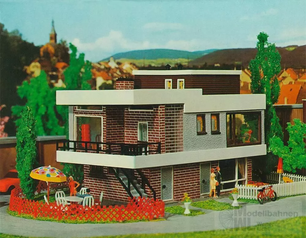 Ein Modell der Klassiker-Reihe, Erstauflage 1974. Das Modell präsentiert ein zweistöckiges Flachdachgebäude mit einem versetzten Staffelgeschoss, das dem Stil dieser Ära entspricht. Die Fassaden zeigen eine harmonische Vielfalt aus rotem Backstein, Putz und Holzverkleidung. Der Zugang zur zweiten Etage erfolgt über eine Außentreppe, während großflächige Fenster Einblicke in das Interieur gewähren, das die charakteristische und umfangreiche Inneneinrichtung des Bausatzes widerspiegelt.