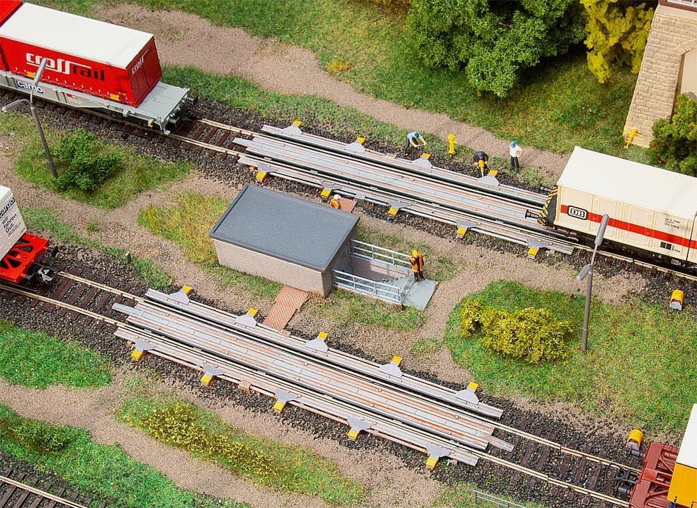 Set bestehend aus zwei Gleisbremsen und einem Bedienungsstand. Die 215 mm langen, parallel zu den Gleisen liegenden Bremsschienen reduzieren an Abläufen die Geschwindigkeit von Schienenfahrzeugen durch beidseitiges Anpressen von Bremsbacken gegen die Radkränze. Modell ohne Funktion.