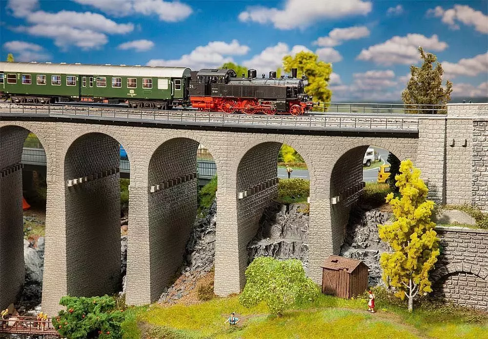 Set bestehend aus einer geraden Viaduktbrücke mit Gleisbett und hohen Pfeilern. Im Bausatzumfang sind eine Brückenkopfgarnitur und ein zusätzlicher Pfeiler zur Verlängerung der Brücke enthalten. Geeignet für Märklin C-Gleis und alle anderen Gleise.
