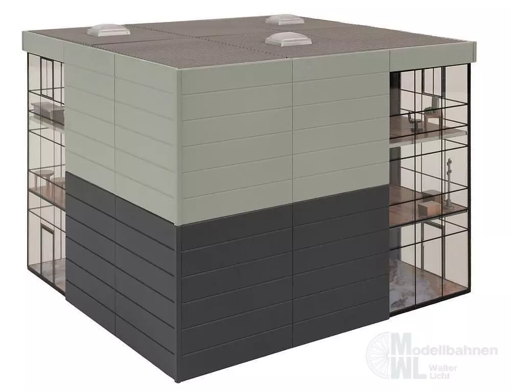 Das zweckmäßig und großflächig verglaste Bürogebäude mit Oberlichtern kann so in jedem modernen Industriegebiet, Hafen oder in der Stadt stehen. Die großen Glasfassaden laden dazu ein, viele Details im Innenleben eines Büroalltags in 1:87 gekonnt in Szene zu setzen, wobei der Einsatz zusätzlicher Lichteffekte (nicht im Bausatz enthalten) garantiert eine unvergleichliche Stimmung auf die Modelleisenbahnanlage zaubert. Die im Bausatz enthaltene attraktive Innenausstattung ist in jedem Fall ein Blickfang.