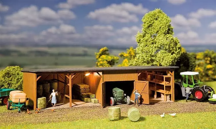 Überdachter Lagerschuppen für die trockene Einlagerung von Heu- und Strohballen mit offener, kpl. eingerichteter Werkstatt und Fahrzeuggarage (Tore sind zu öffnen). Heuballen und andere typische Zubehörteile für die Werkstatt liegen bei. Dieses Gebäude darf auf keinem Bauernhof fehlen.