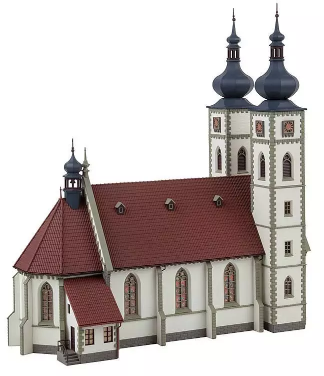 Große, doppeltürmige Stadtkirche mit halbrunder Apsis und seitlichem Zugang zur Sakristei. Die beiden Türme lassen sich wahlweise mit Zwiebel- oder Spitzhaube bauen.