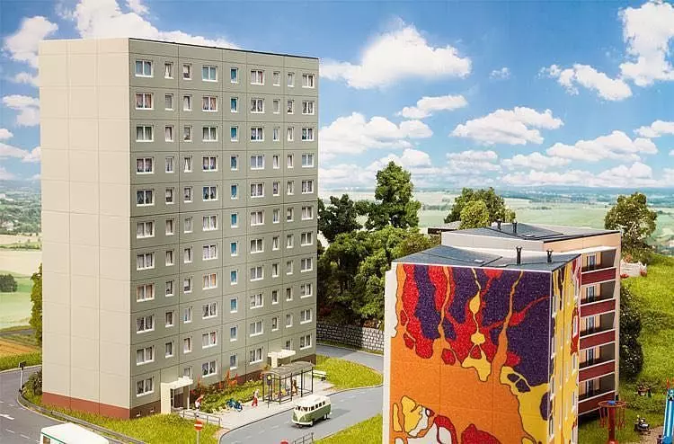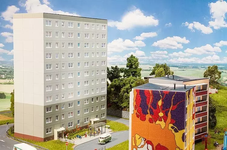 Die gute, alte Platte. Modulares Modell des in der DDR bis Ende der 60er Jahre am häufigsten gebauten Plattenbautypus. Das P in der Bezeichnung steht für parallel, weil die tragenden Wände parallel zu den Fassadenwänden angeordnet sind. Die 2 steht für die Anzahl der Aufgänge. Zum Umfang der Basispackung gehören der um ein halbes Geschoss herausragende Sockel mit Eingängen, 3 Stockwerke mit Balkonen auf der rückwärtigen Seite sowie Drempel und Flachdach. Das Model kann modifiziert auch als Relief im Anlagenhintergrund verwendet werden. Bitte beachten Sie: jeweils zwei ergänzende Stockwerke, um das Modell bis zu einer Geschosshöhe mit den üblichen 5-11 Stockwerken zu erweitern, enthält der Artikel Plattenbau P2 Ergänzung (Art. 130802).