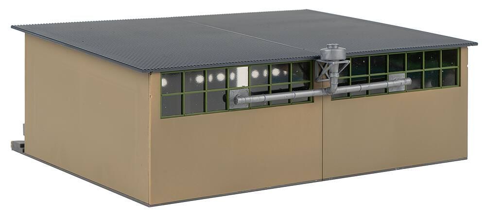 3-ständige Reparaturhalle mit offen oder geschlossen darstellbaren Falttoren und rückwärtigen Belüftungsventilatoren. Für eine Erweiterung der Halle können mehrere Exemplare des Modells nebeneinander gebaut werden.